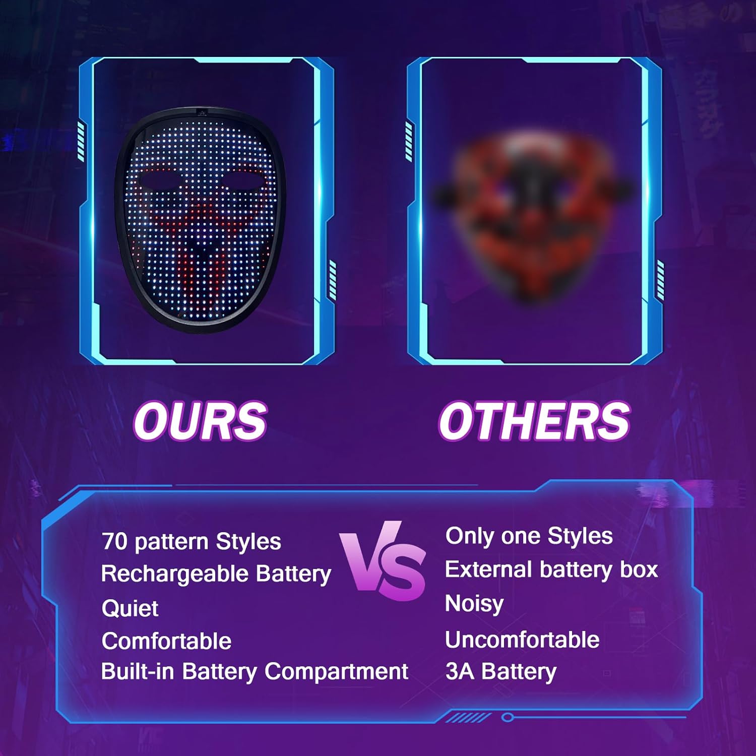 • Long-lasting Power: USB Type-C charging (5V/1A); first charge takes 3-4 hours, and the battery life lasts up to 10 hours, making the LED face-changing mask perfect for long-term use at festivals, schools or outdoor activities.