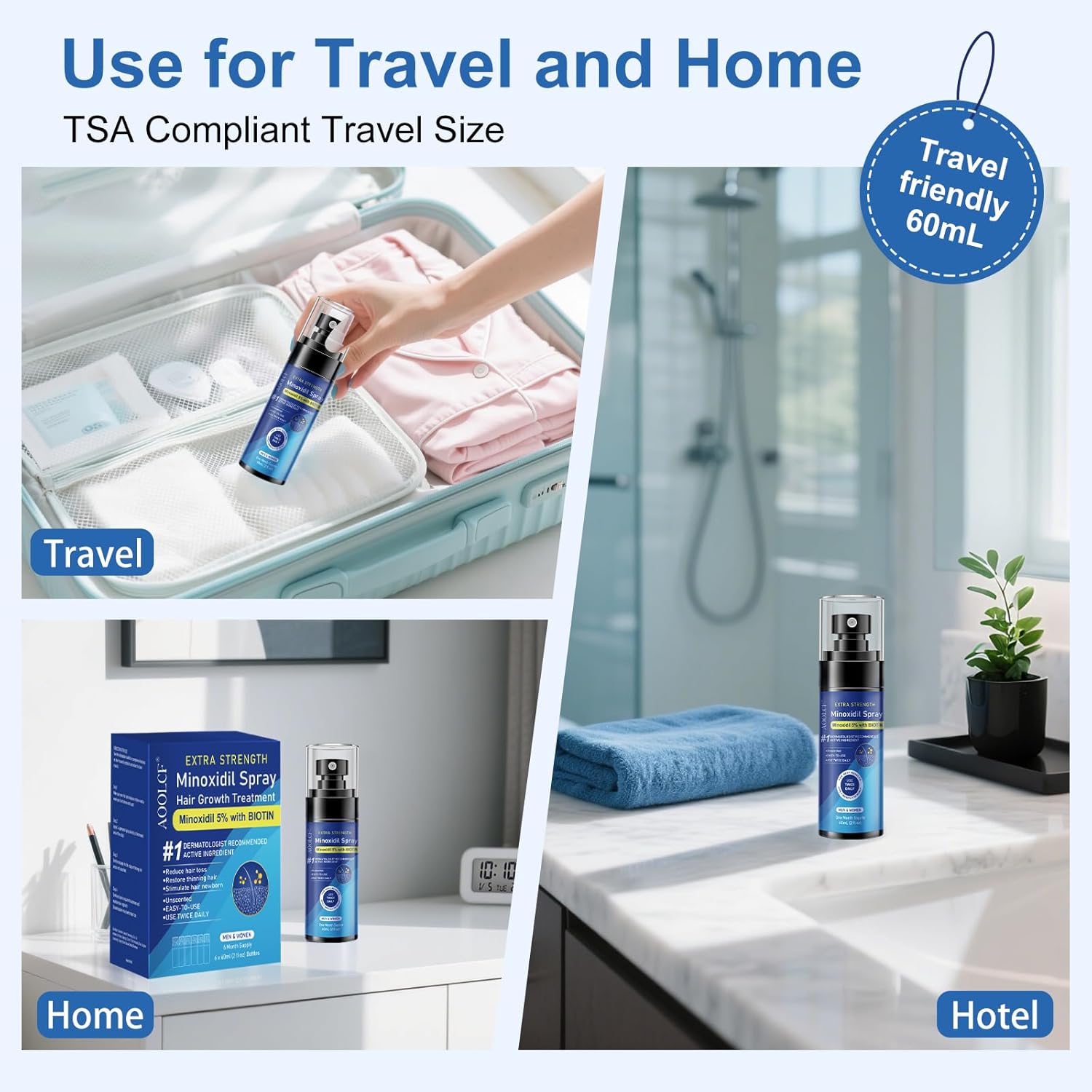• ADVANCED FORMULA - AOOLCF Minoxidil Spray combines 5% Minoxidil, 0.5% Biotin, Castor Oil, Panthenol, and Glycerin to stimulate hair regrowth, resulting in noticeably thicker, fuller, and younger-looking hair