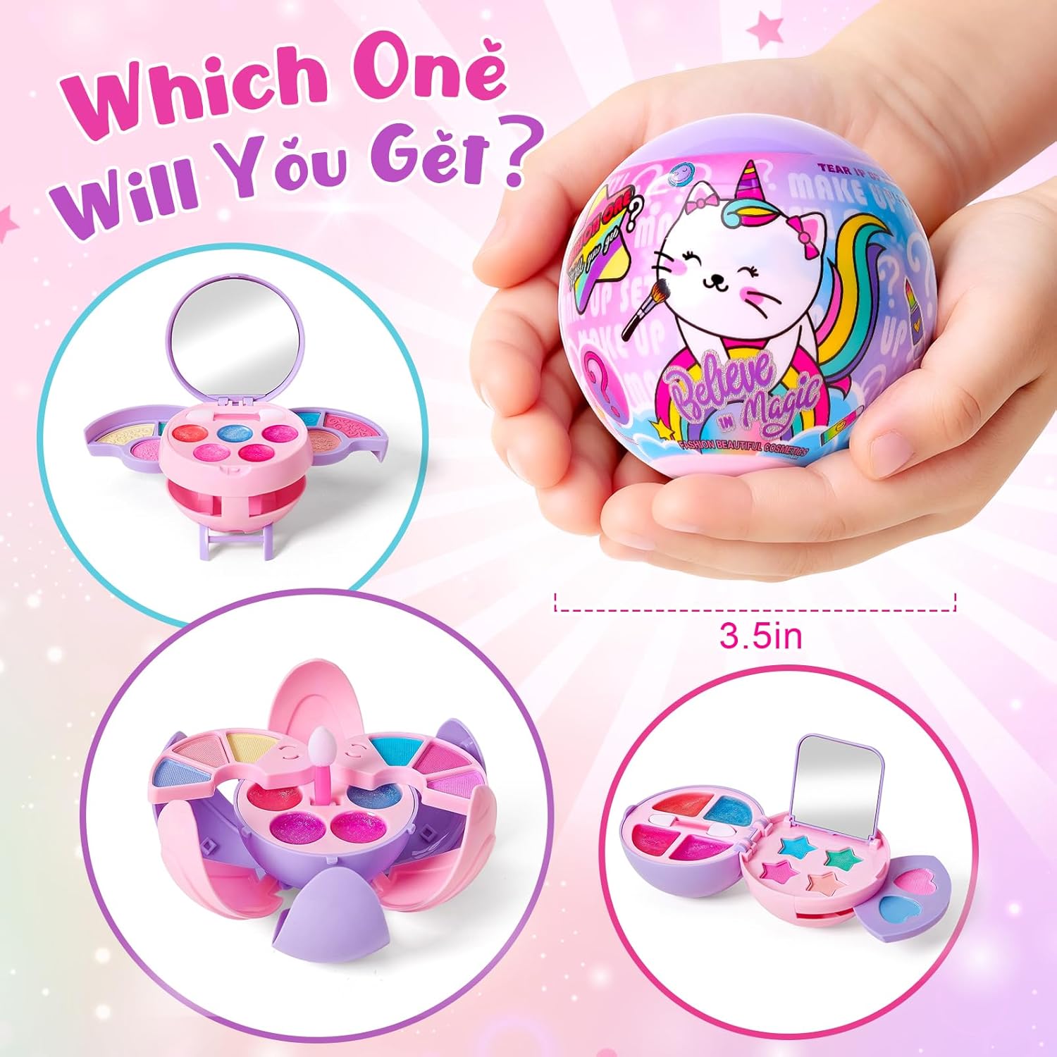 • Girls Sleepover Party Supplies: Watch girls gather to compare discoveries on the makeup-themed party! After unboxing, they naturally trade duplicates, fostering social interaction while collecting all 3 styles. It is also good for nighttime playdates: Balls become collaborative games, guess the style before opening! Apply washable makeup for pretend make up play, easily removed before bedtime with water