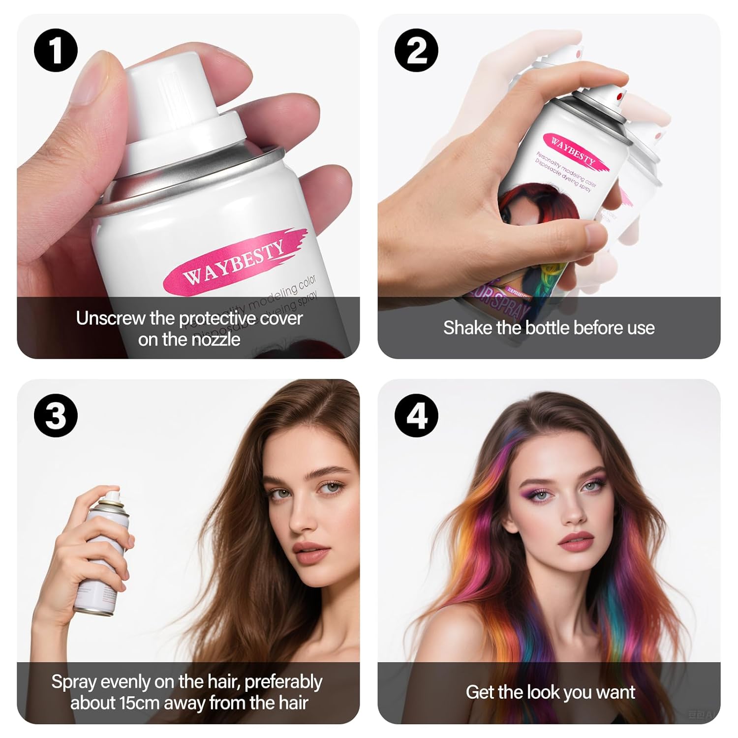 • 1. Instant Vibrant Color---- Get Bold, Vibrant hair in seconds! Our Temporary hair color spray delivers rich,fade-resistant shades that last all day, perfect for parties, costums, or fun style experiments.