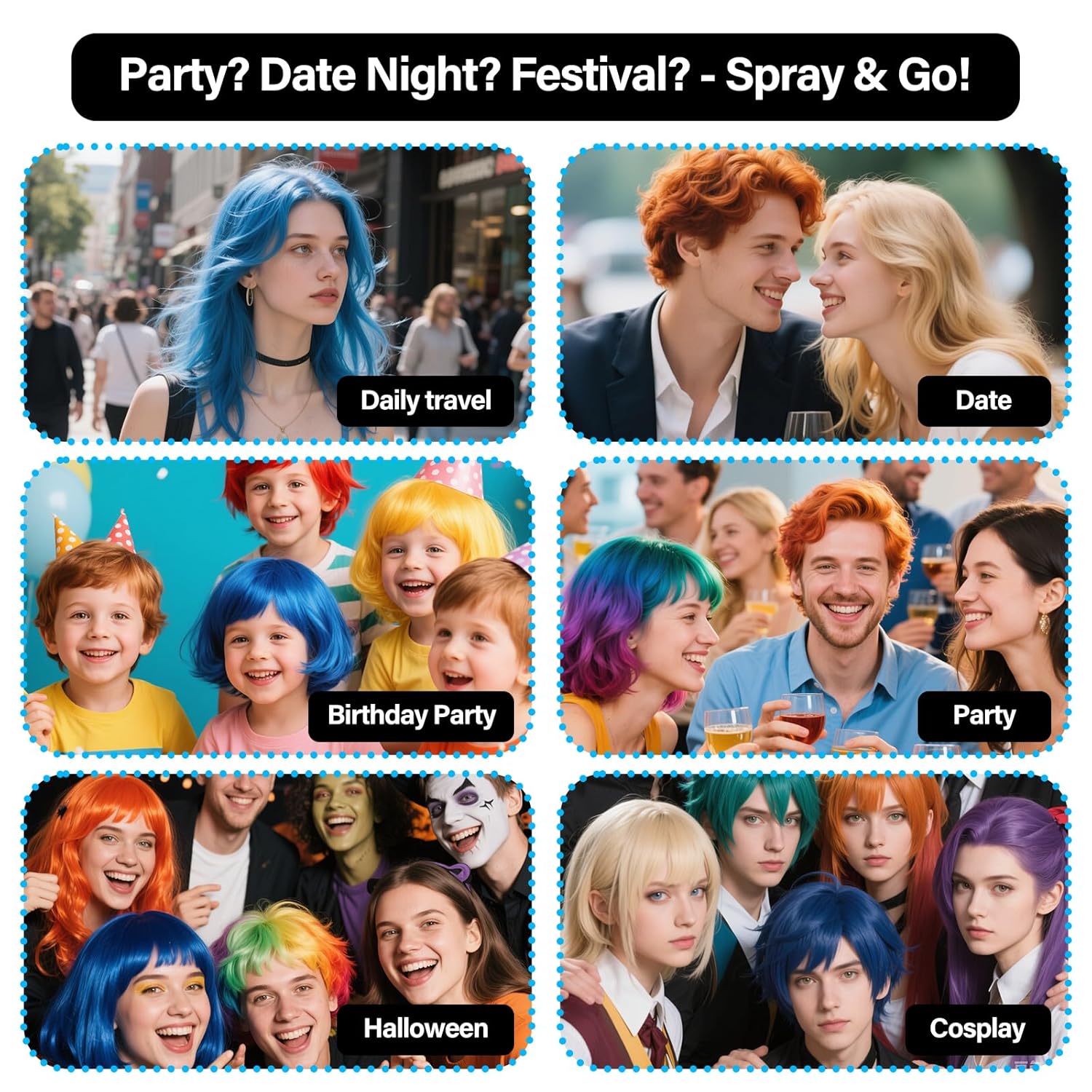 • 5. Perfect for Parties & Cosplay Halloween, raves, or everyday fun! Glow under UV lights or rock pastel pink, electric blue, or fiery red—washable hair Spray for limitless creativity!
