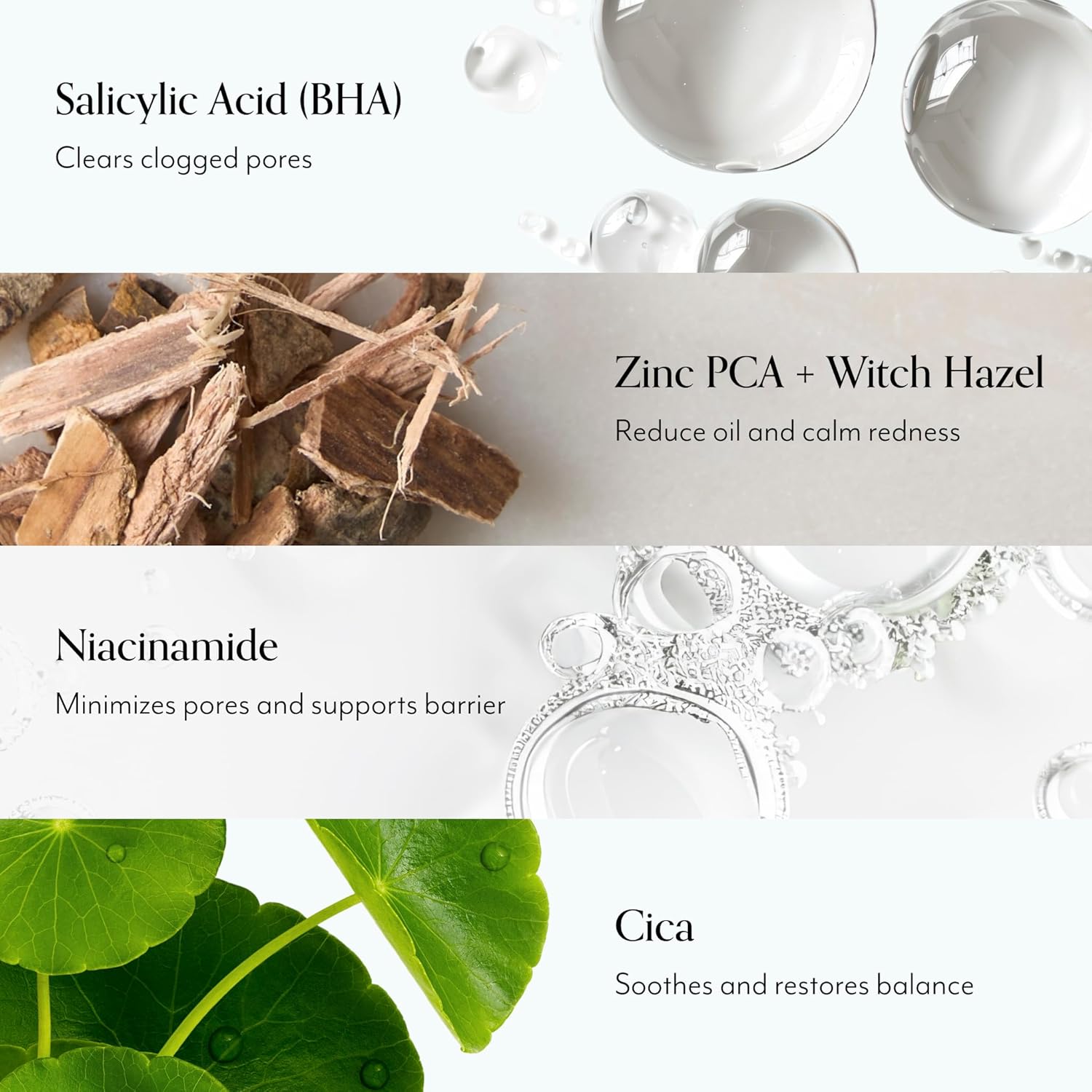 • KEY INGREDIENTS: BHA (SALICYLIC ACID): Helps loosen dirt and excess oil from congested pores while promoting the easy removal of dead skin on the surface. WITCH HAZEL: A natural astringent that helps soothe and tone while decongesting clogged pores. NIACINAMIDE: Helps minimize the look of pores and blemishes while boosting skin’s protective shield. ZINC PCA: Helps to regulate skin’s oil production while calming the appearance of redness. CICA: Known to calm and soothe skin."