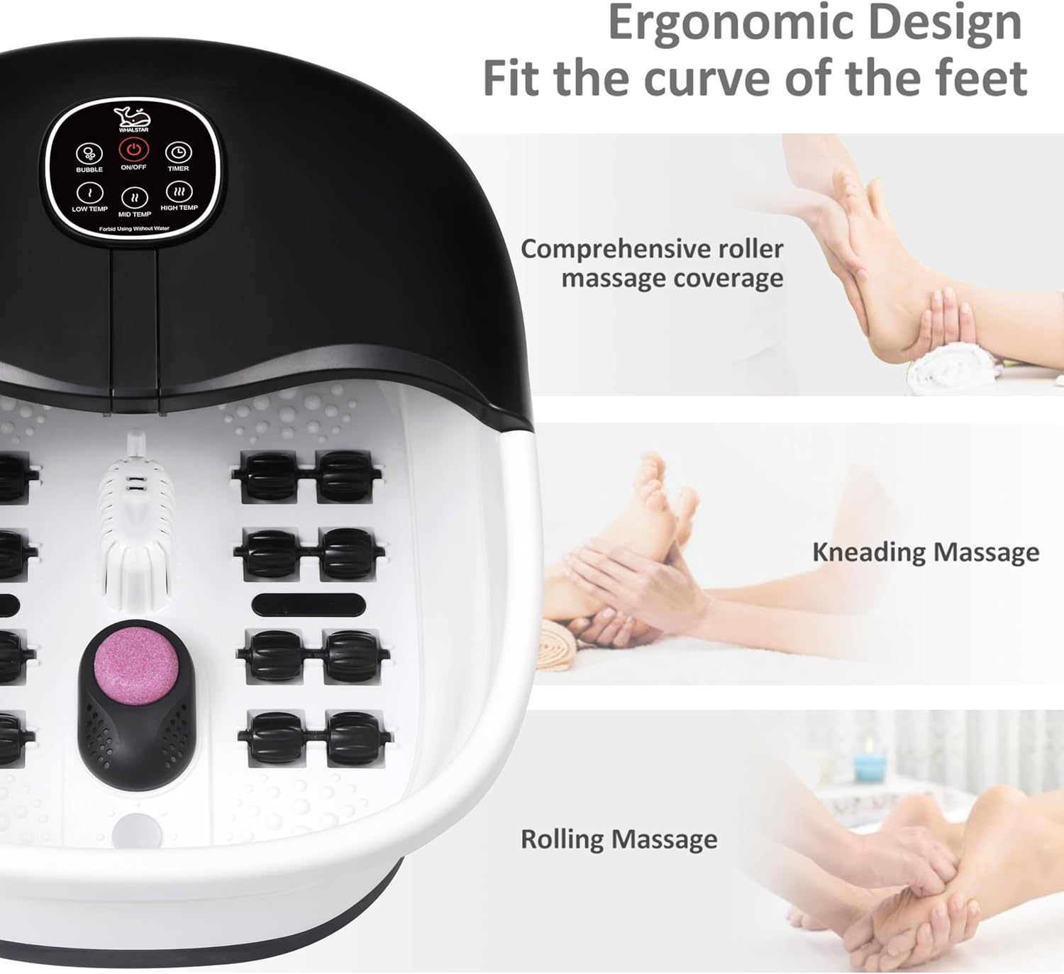 • 【Fast Heating & Temperature Control】WHALSTAR Foot Spa Bath Massager with Heat Bubbles and Vibration Massage and Jets can heat up water efficiently and maintain water at selected temperature (105-113°F). Its 500W PTC Heater is with safe and secure multi-insulation protection and overheating protection, so you needn't worry about the safety. For home pedicure foot spa soak, soaking feet in WHALSTAR foot bucket can not only enhance the therapeutic effect, but also relieve fatigue, swelling & redness.