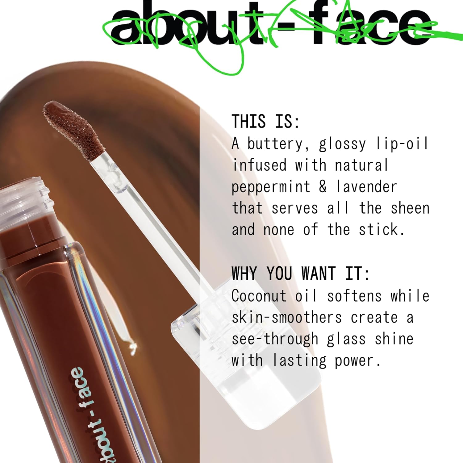 about-face Light Lock Lip Gloss Dare To Bare – Non-Sticky, High-Shine Lip Oil Gloss with Coconut Oil, Peppermint & Lavender – Vegan, Cruelty-Free, Clean Beauty – 0.21 oz (Caramel)