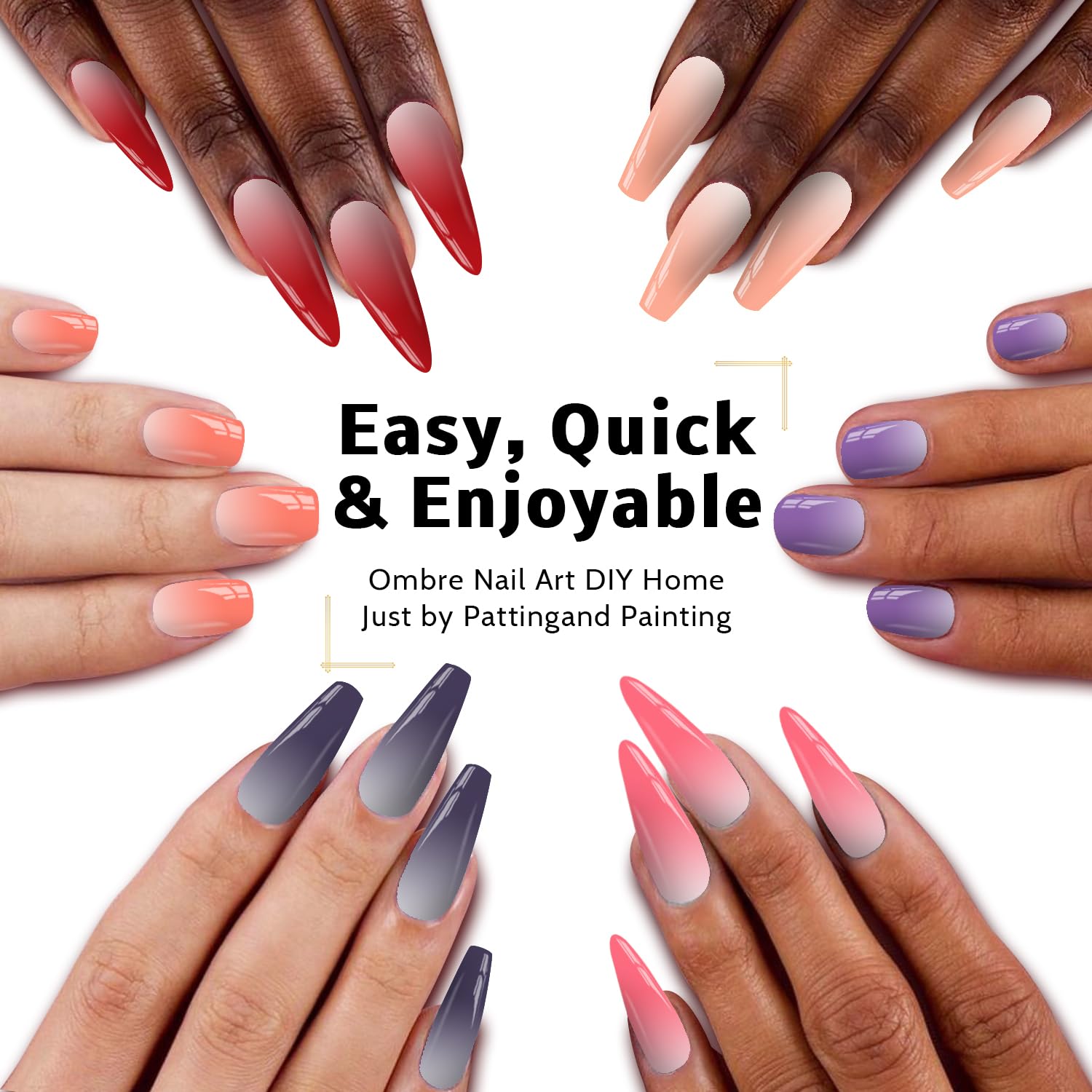 • 【EASY USE:】All steps are the same as normal UV/LED nail gel: 1.Clean and Prep; 2. Base coat and cure. 3. Apply color gel and cure. 4. Top coat and cure. 5. Clean nails and apply oil. Karroy ombre painting nail gel is easy to use: just grabbing a sponge and picking up your desire color, and patting sponge on your nail, you will get wonderful gradient coloring nails!