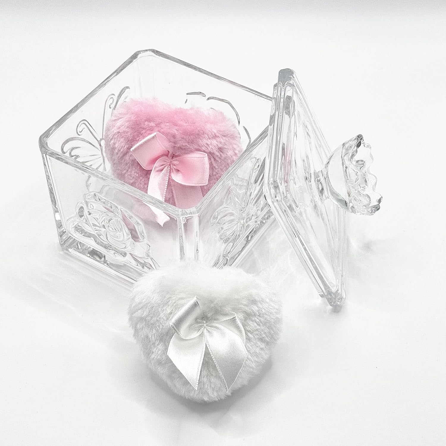 • 【You will get】 1 x Glass Powder Puff Case, reusable one white puff and one pink puff. Transparent glass material, heart-shaped design, both aesthetic and ceremonial, suitable for gift or makeup table decoration. Powder puffs are soft and reusable, wet and dry