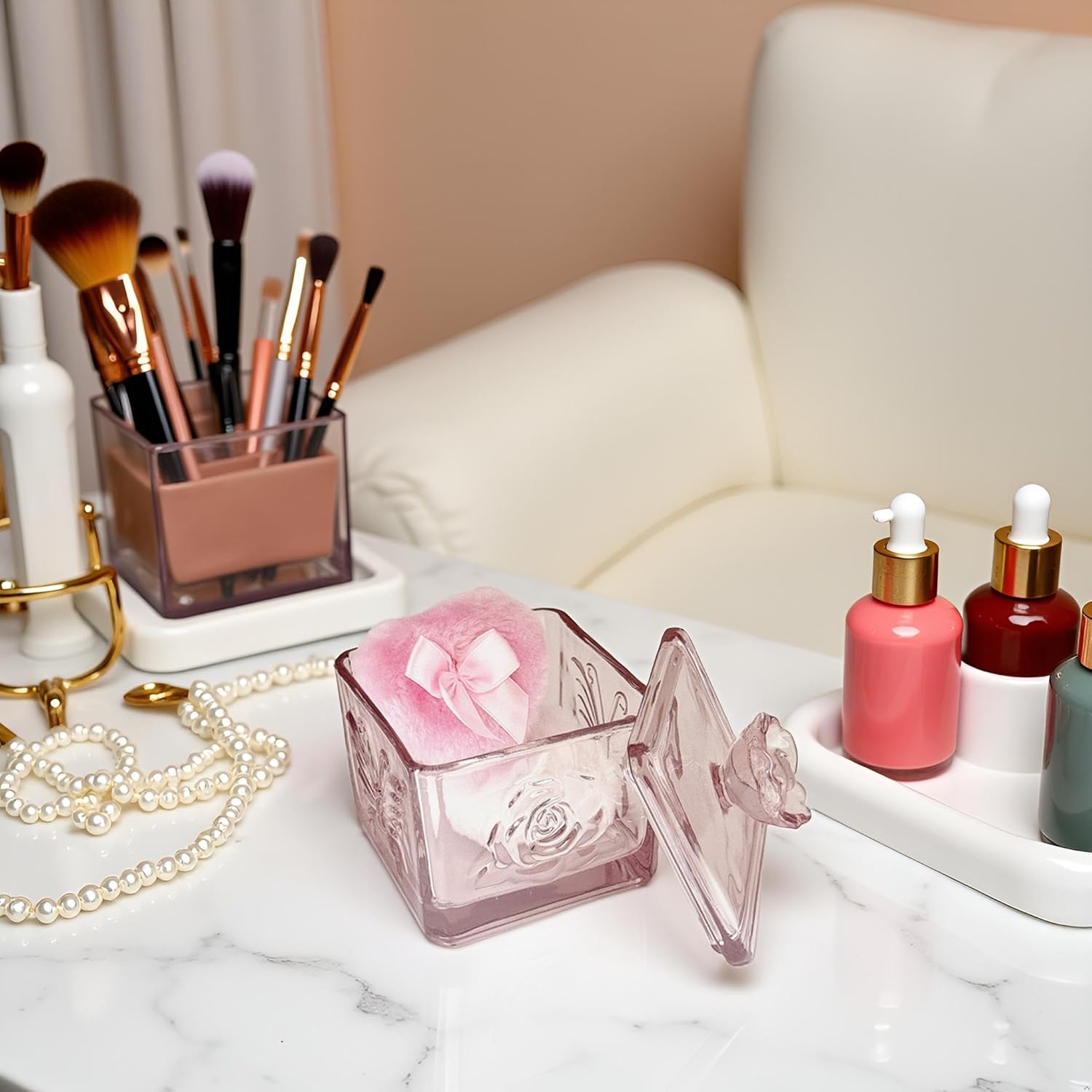 • 【Multi-Purpose Glass Box】This glass powder puff case can not only be used to store powder puffs, but also can be used to store earrings, rings, bracelets, hair accessories, knick-knacks, as well as other items in the dresser, bathroom and bedroom. It keeps your items away from dust and water, protects and decorates, and meets the needs of female users for cosmetic organization