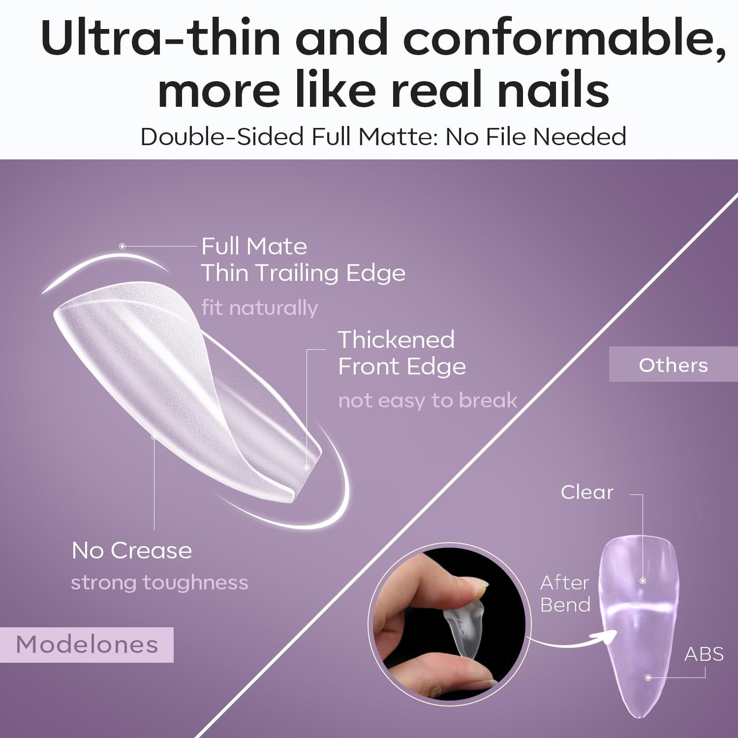 • Stronger Adhesion & Natural Nail Feeling: Modelones upgraded fully frosted texture for increased friction, which makes our soft nail gel tips feature stronger adhesion and a better fit on your nails. With high-quality soft nail gel material, strong toughness and malleability, thin and light with a thin back edge that fits perfectly on the cuticle of your fingers and a thick front edge that is very strong and resistant to breakage and no folding marks, more like natural nails
