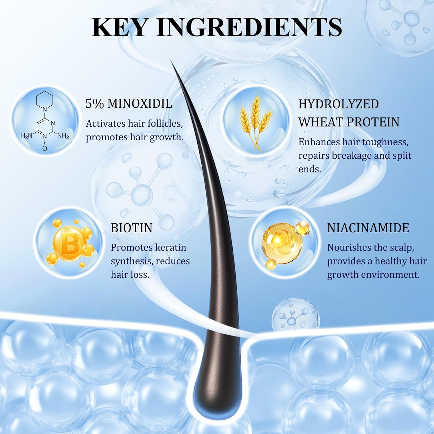 • Carefully Matched: Hair growth spray contains 5% minoxidil, combined with hydrolyzed wheat protein, biotin, which can nourish the scalp, repair hair breakage and split ends, effectively reduce hair loss, and help grow stronger, thicker and fuller hair.