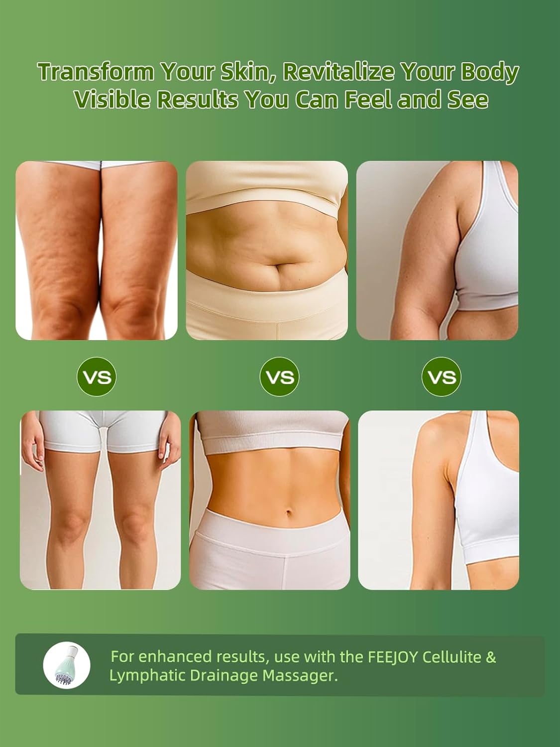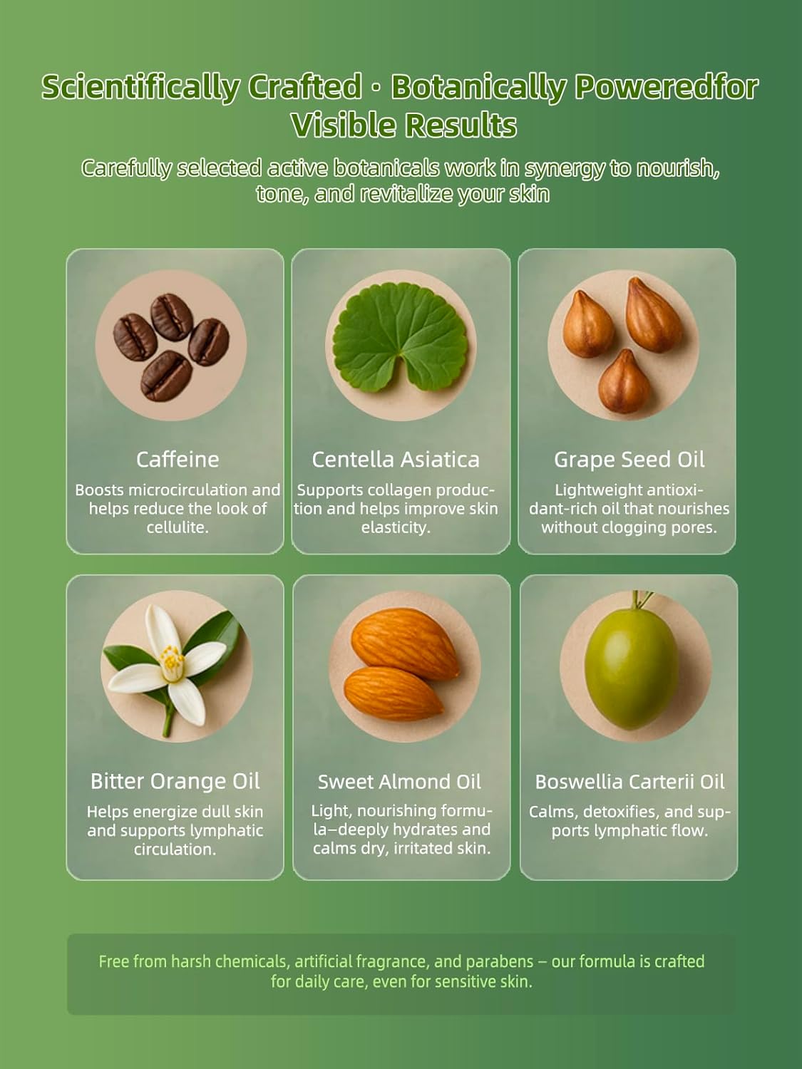 • 4-in-1 Botanical Formula – Smooth, Detox, Firm, Nourish: Powered by caffeine, centella asiatica, bitter orange oil, and a blend of nourishing carrier oils, this multi-action formula helps reduce cellulite, support lymphatic flow, tighten skin, and deeply hydrate.