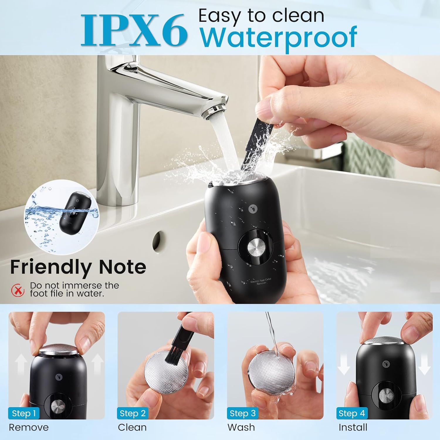 • IPX6 Waterproof Foot File-Wet or Dry Use: The high-speed grinding head removes calluses from dry or wet feet with a light touch—no need for heavy rubbing . After use, simply rinse it under the faucet; debris washes away instantly, eliminating the hassle of manual cleaning.​ Note: Keep it away from the charging port to avoid soaking and extend its lifespan.