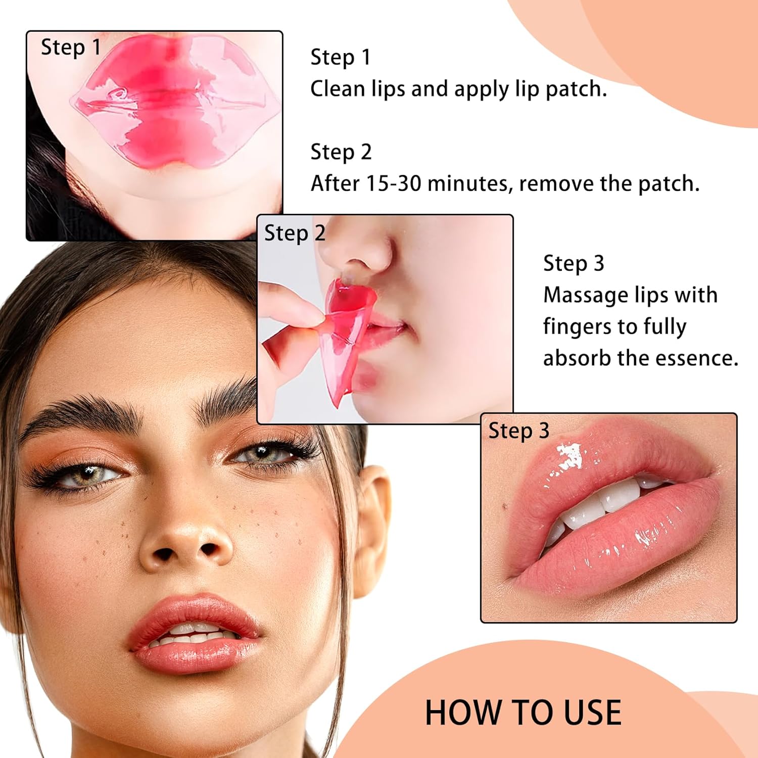 • Easy to Use: Take the lip mask patches out of the individual package, gently unfold them, place the lip patches flatly on the lips, make sure they are in full contact with the lip skin, leave them on for 15-20 minutes, remove the lip mask sheets and finally gently massage the lips until they are absorbed