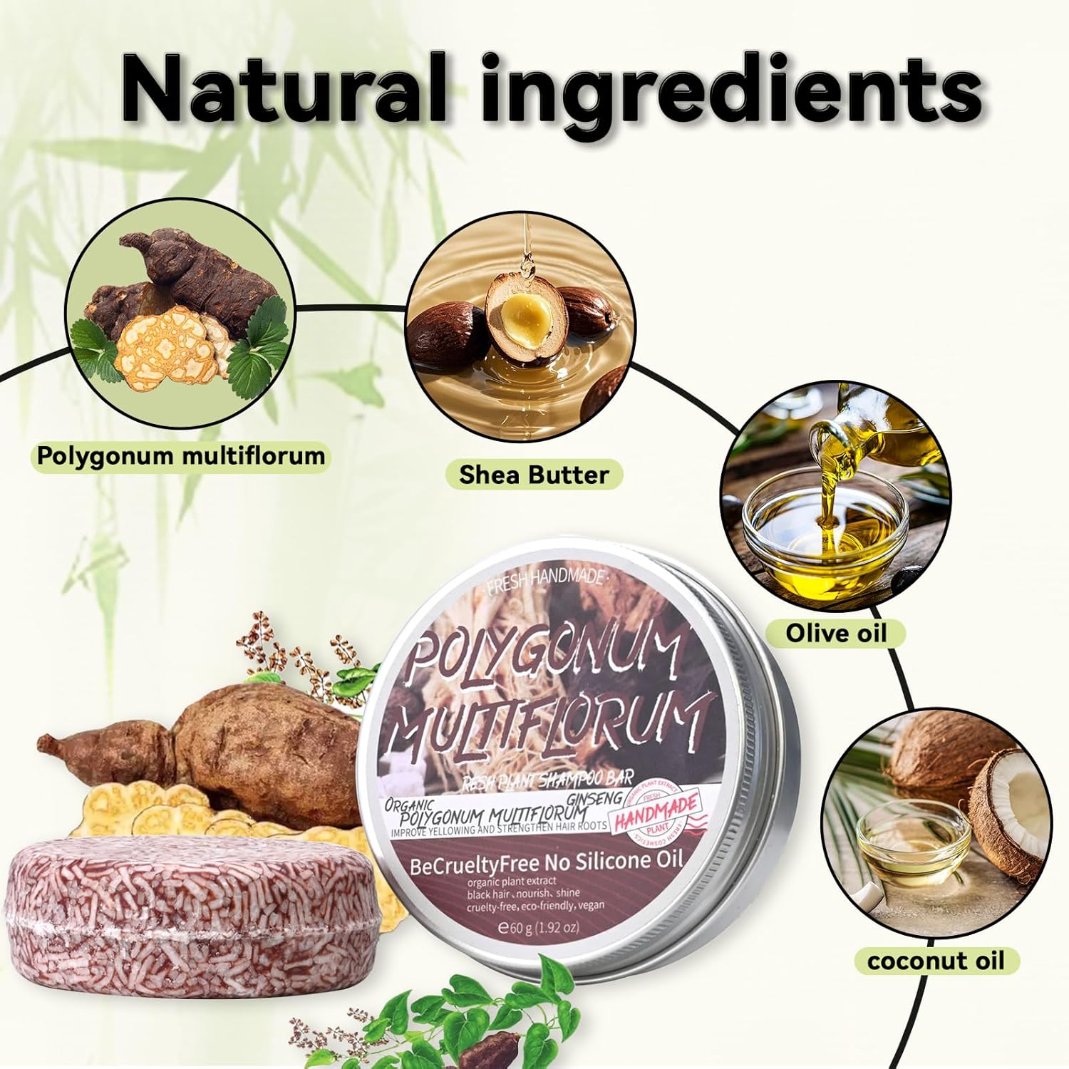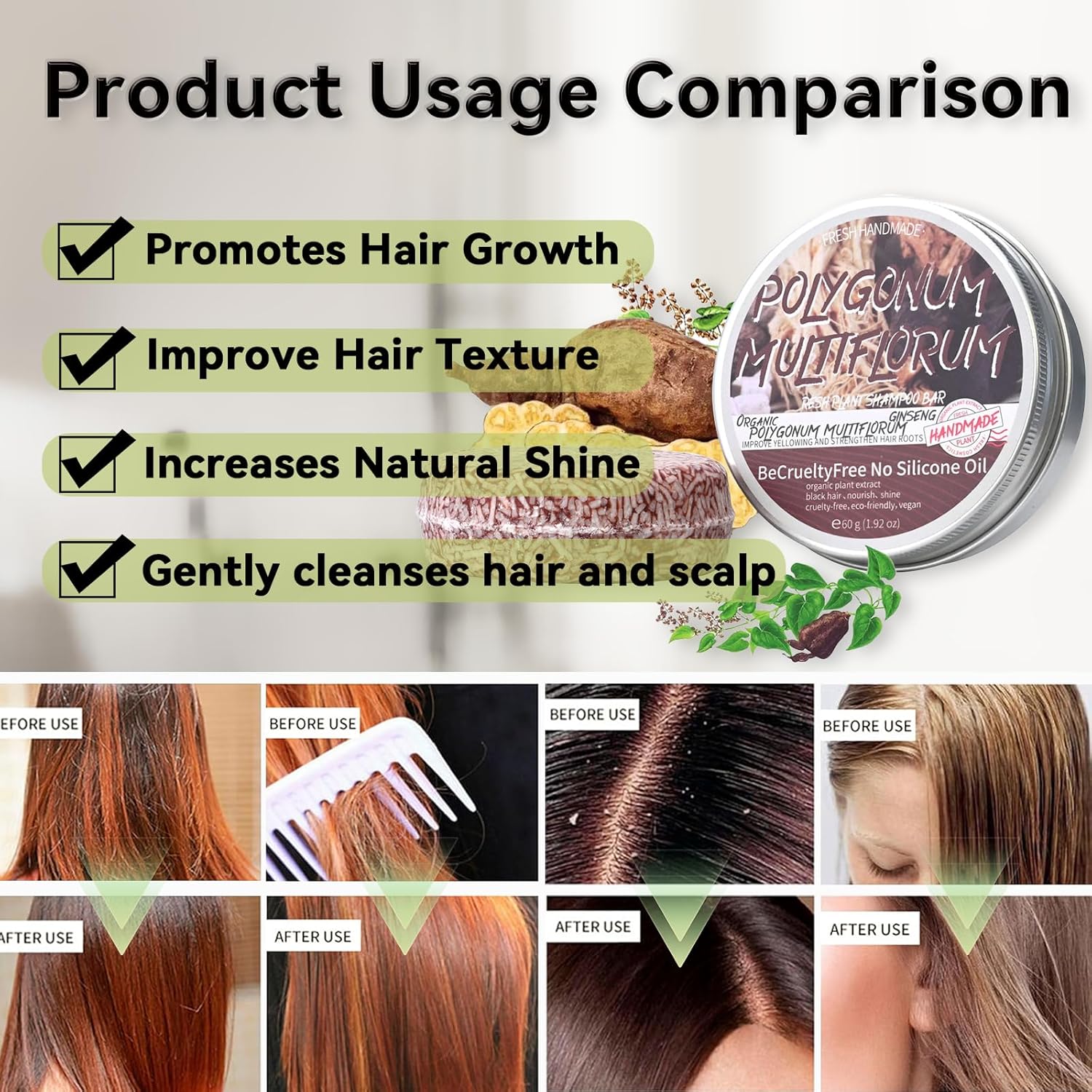 • 【Safe Ingredients】Shouwu Blackening Shampoo Bar uses pure natural ingredients, including shouwu blackening extract, shea butter, olive oil, coconut oil, and other ingredients. It has a mild effect and does not hurt the scalp. Therefore, you can use it with confidence even if you have sensitive skin.