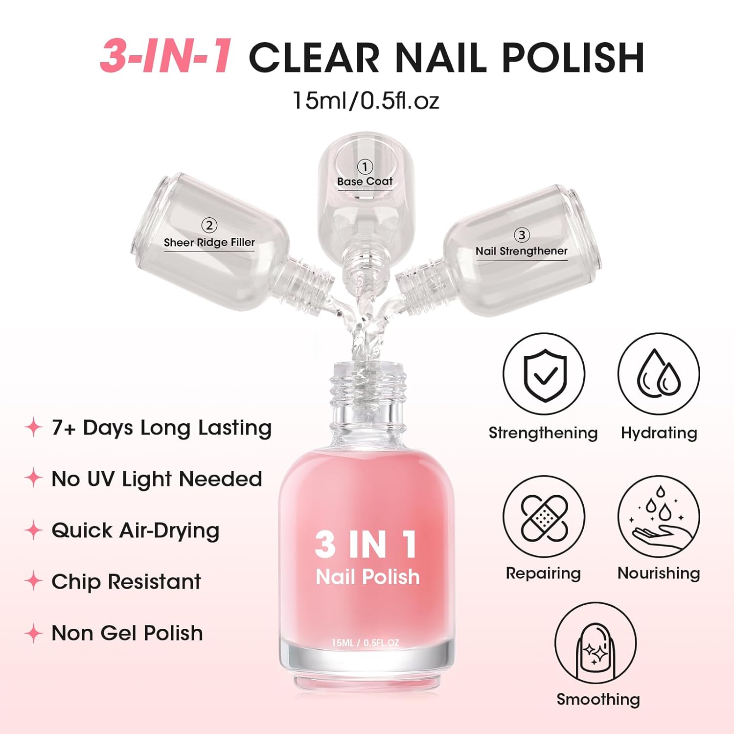 • Model Name : 3-In-1 Clear Nail Polish, Nail Ridge Filler, Nail Corrector Base Coat, Nail Strengthener and Growth Prevents Breakage, Tinted Pink Enhances Natural Look 3-In-1 Clear Nail Polish, Nail Ridge Filler, Nail Corrector Base Coat, Nail Strengthener and Growth Prevents Breakage, Tinted Pink Enhances Natural Look
