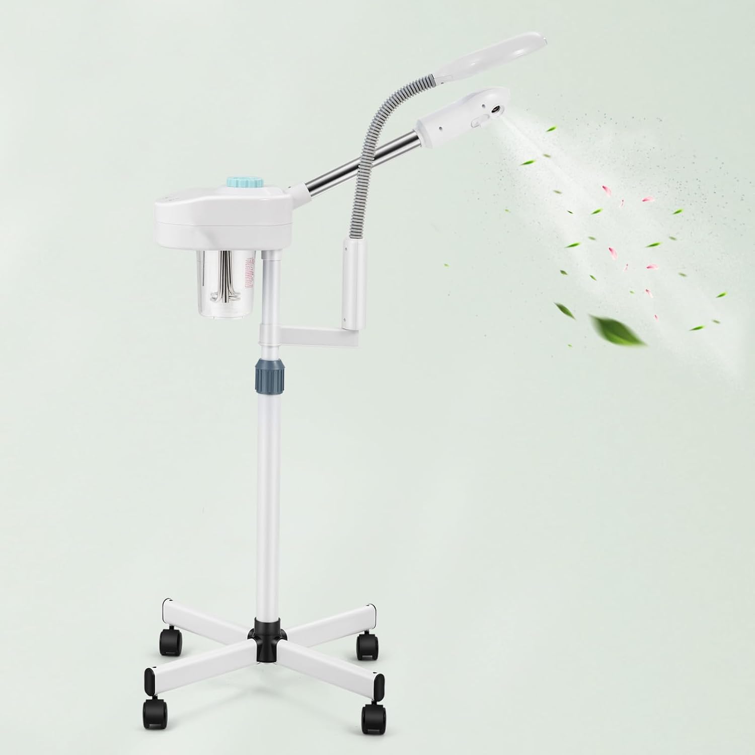 • 【Mobile Stand with Adjustable Sprayers】4-wheeled base moves freely around your space. Adjustable height + 180° rotating nozzles target steam to face/sinuses—ideal for sinus relief or facial deep cleaning