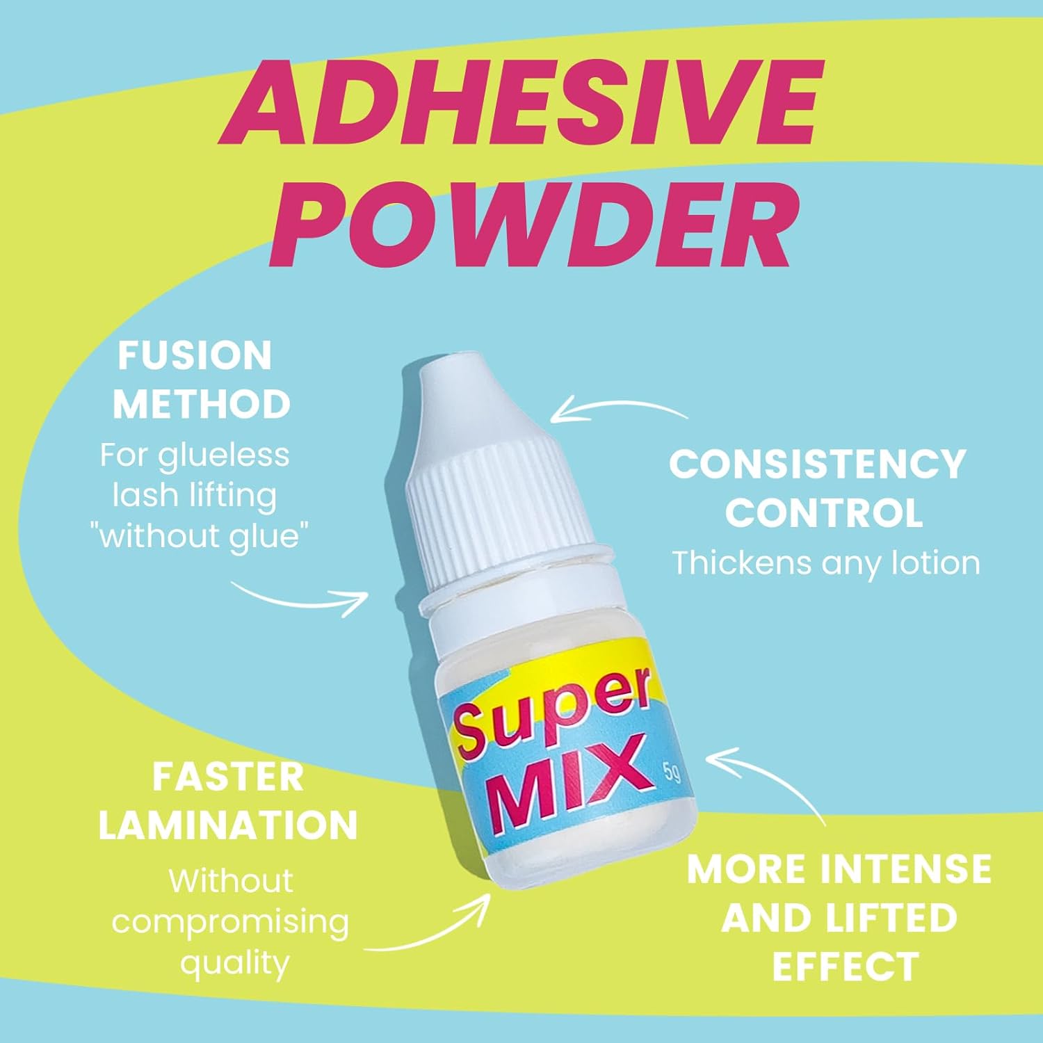 • What's Super Mix Powder? It's a mix of lifting products that can be used to fix eyelash without using glue. A gentle and comfortable alternative for sensitive eyes
