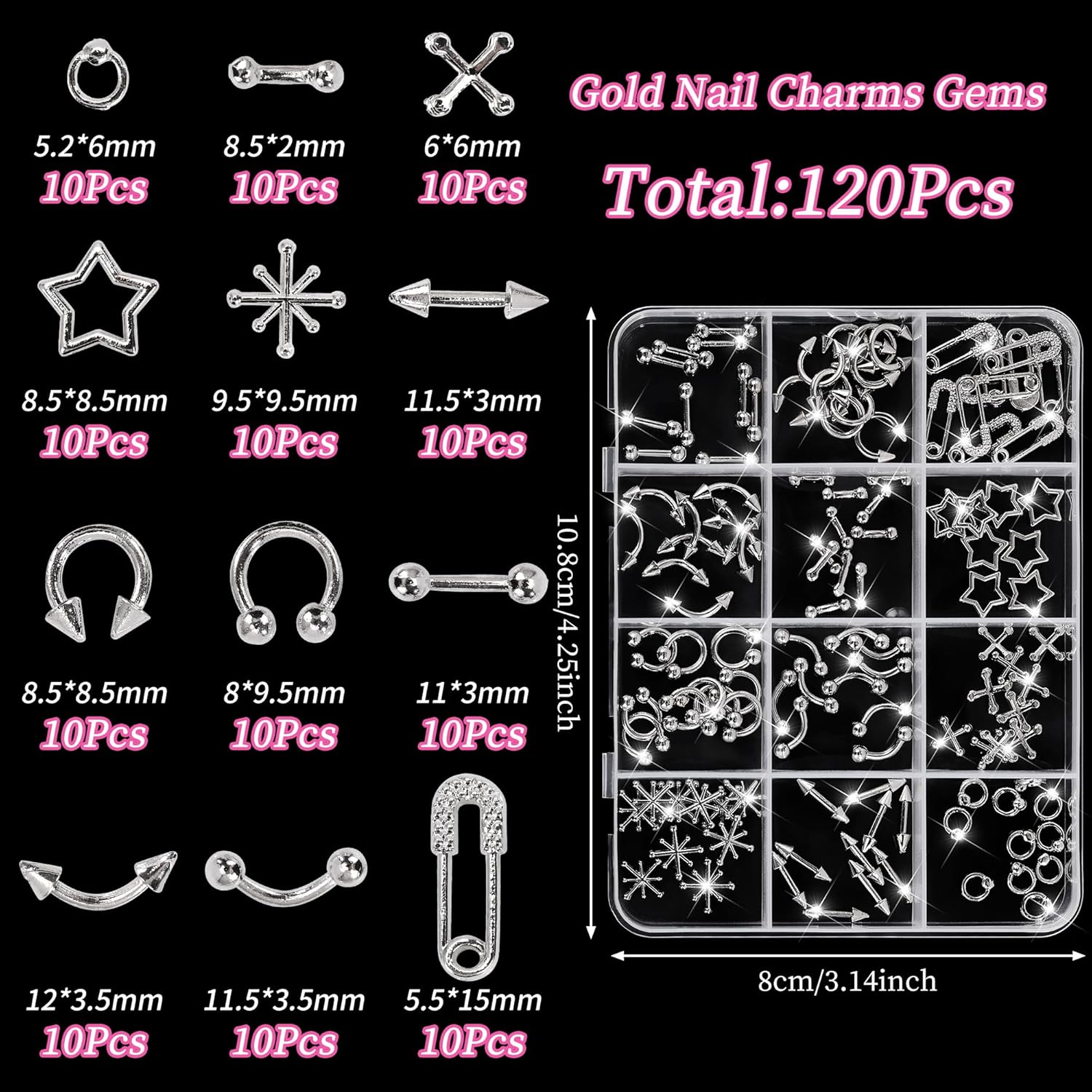 • Package of Nail Art Supplies Includes: 120 Pcs nail gems and charms in assorted styles, for nail decorations. The Y2K nail charms silver offer endless design possibilities to meet all your everyday needs