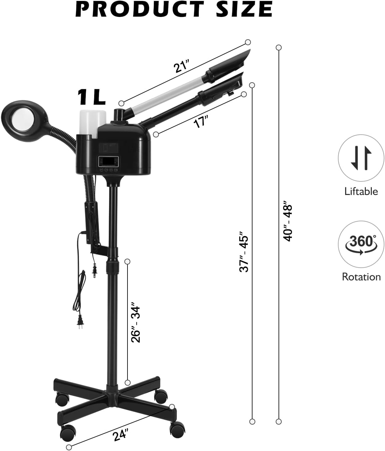 • ROTARY AND MOVEABLE - 360 degree rotary spray pipe allows to moisturize your face; Rolling wheels makes it convenient to move this facial skin care machine around the room. There is an aroma diffuser at the nozzle mouth, you can put the aroma diffuser and use it