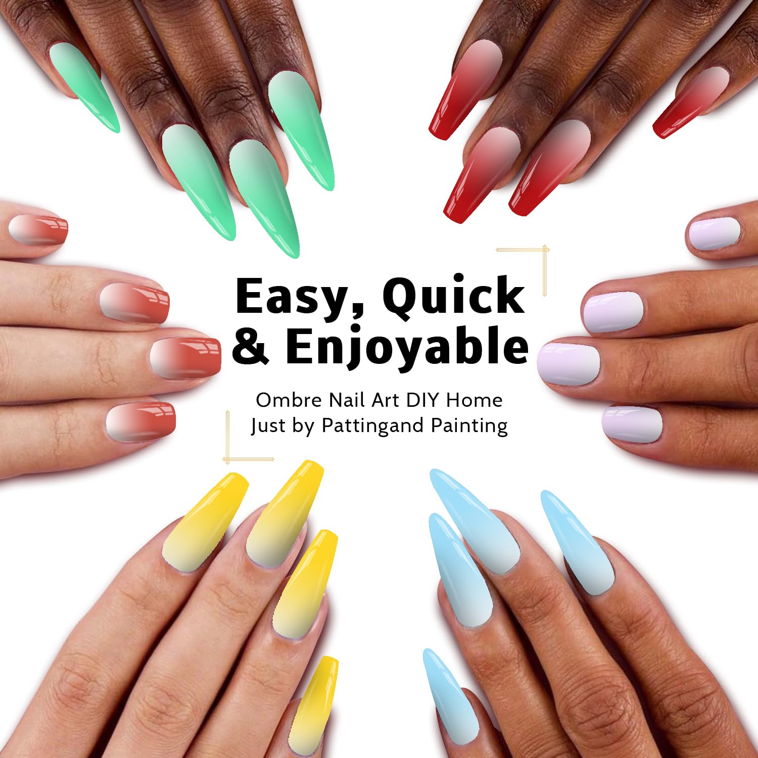 • 【HAVE FUN:】Karroy ombre nail gel will bring you great fun by self-coloring mixing, sponge-patting painting, brushes drawing & dotting, ect. It's easy, colorful, and wonderful! Package list: 9-Color Palette, 6PCS Nail Art Brushes, 1 Grabber, 100PCS Nail Sponges.
