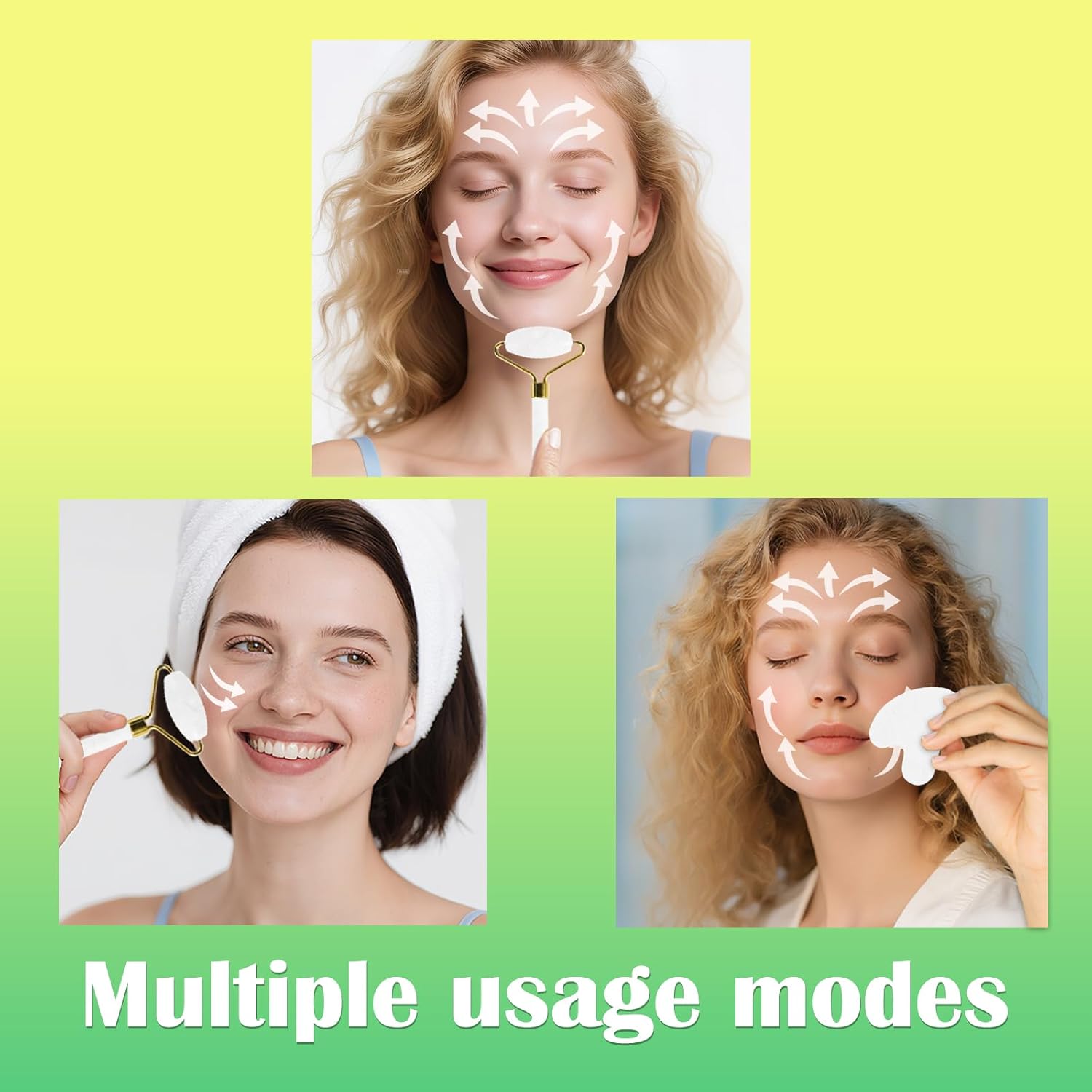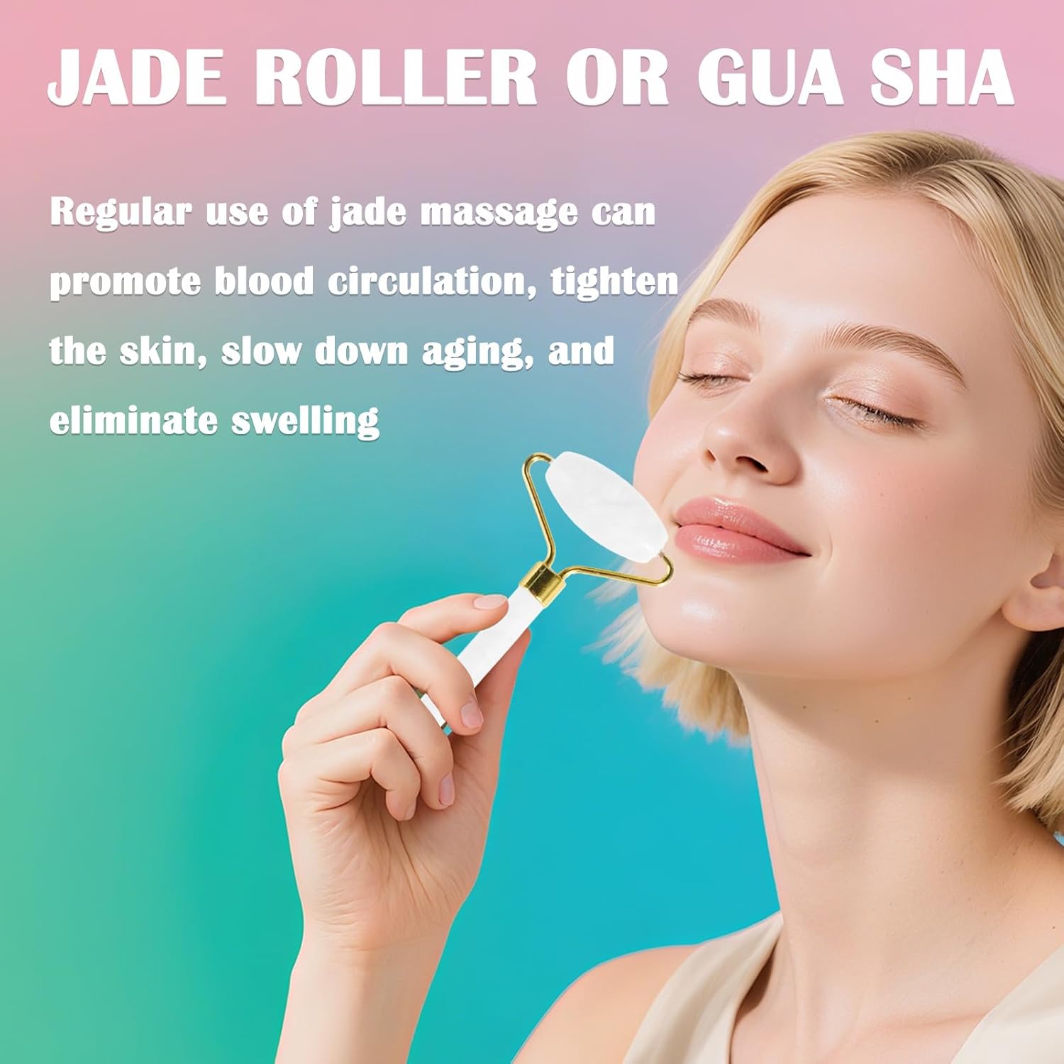 Natural Jade Roller & Gua Sha Set for Face, Facial Massager Tool for Skin Tightening, Anti-Aging, Puffiness Relief, Lymphatic Drainage - Spa Skincare Gift Set for Women (White)