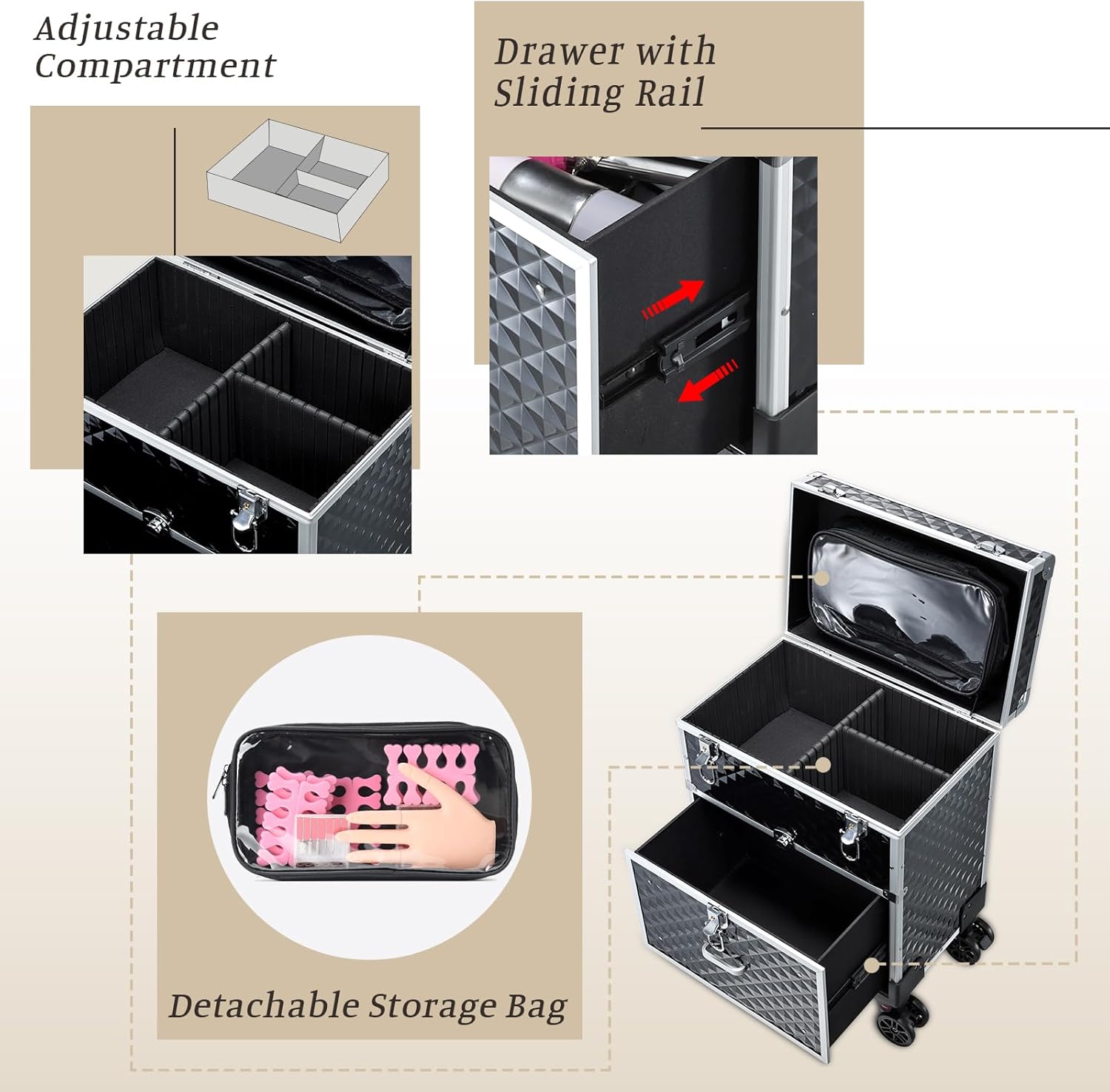 • Multi-Functional Rolling Case - The wheeled rolling makeup case with drawer is designed to meet the needs of professionals such as nail technicians, makeup artists, and hairstylist. It is also coated with pretty diamond stlye finish.