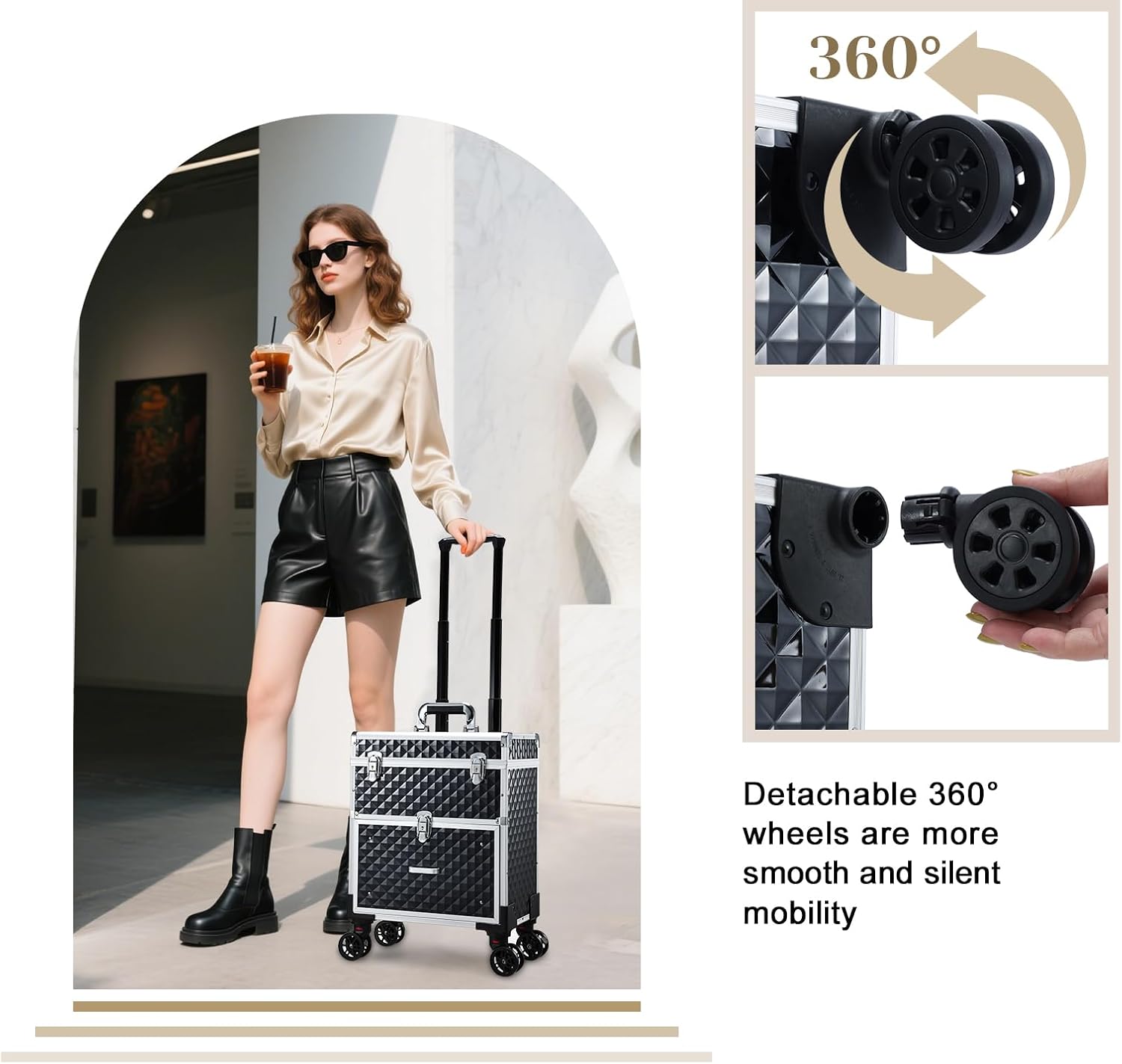 • Enhanced Quality - Designed with a durable aluminum frame and reinforced corners, this rolling makeup case is durable and protects your professional nail/makeup/cosmetic/hair-cutting accessories.