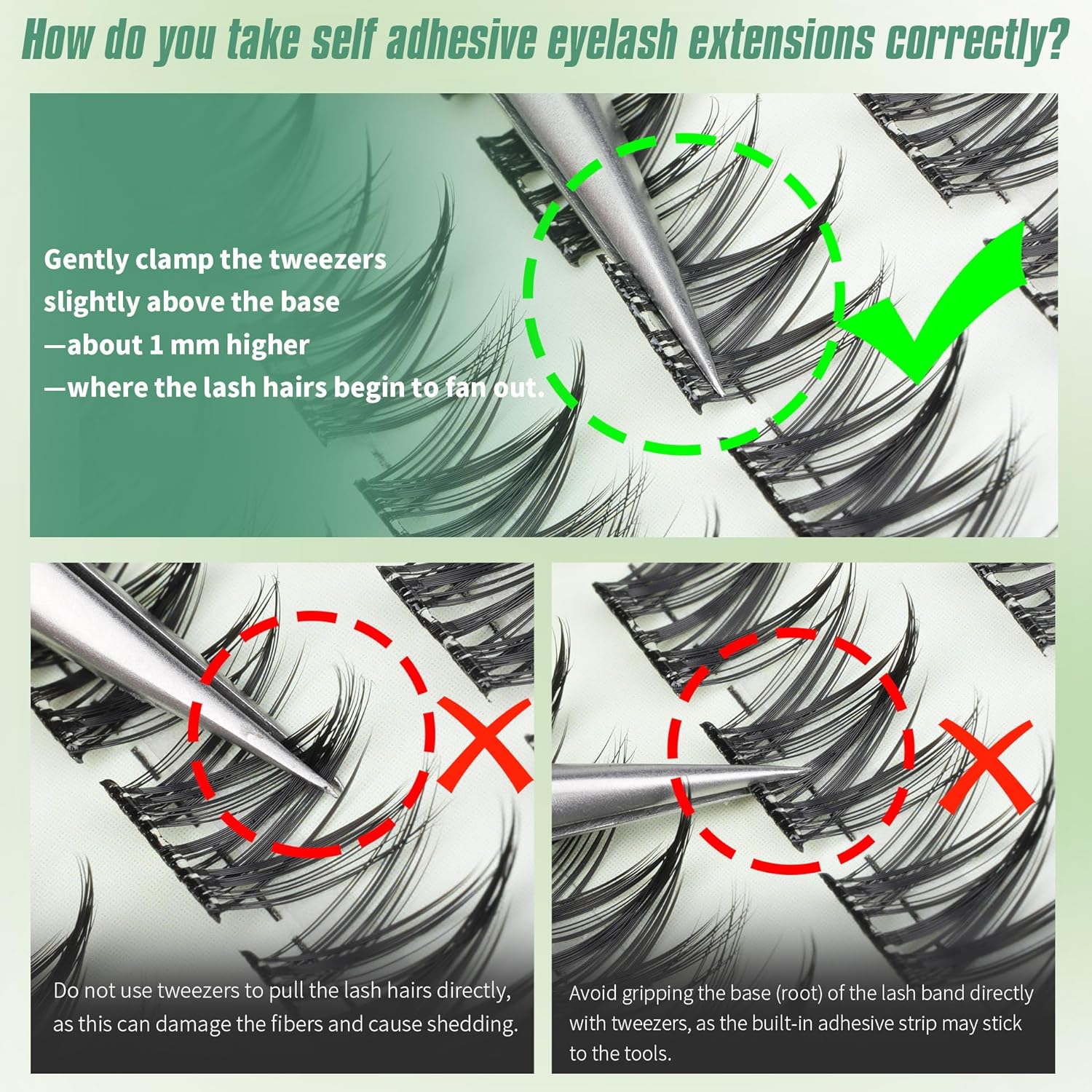 • Featuring invisible self adhesive tapes, these no glue lash clusters blend flawlessly with your natural lashes. The upgraded pre-glue eyelashes offer a strong yet gentle grip, staying put all day without slipping or leaving residue. Enjoy salon-quality stick on lashes with 0 fuss!