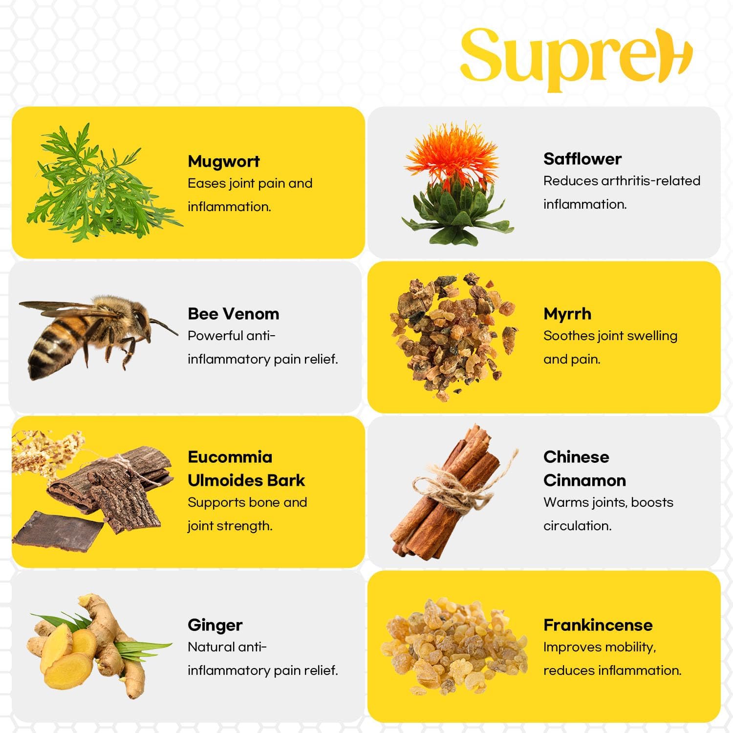 • Effective Arthritis Care Cream – SupreH Bee Venom Cream for Arthritis is a fast-acting soothing pain relief massage gel that delivers deep comfort for sore joints and stiff muscles.