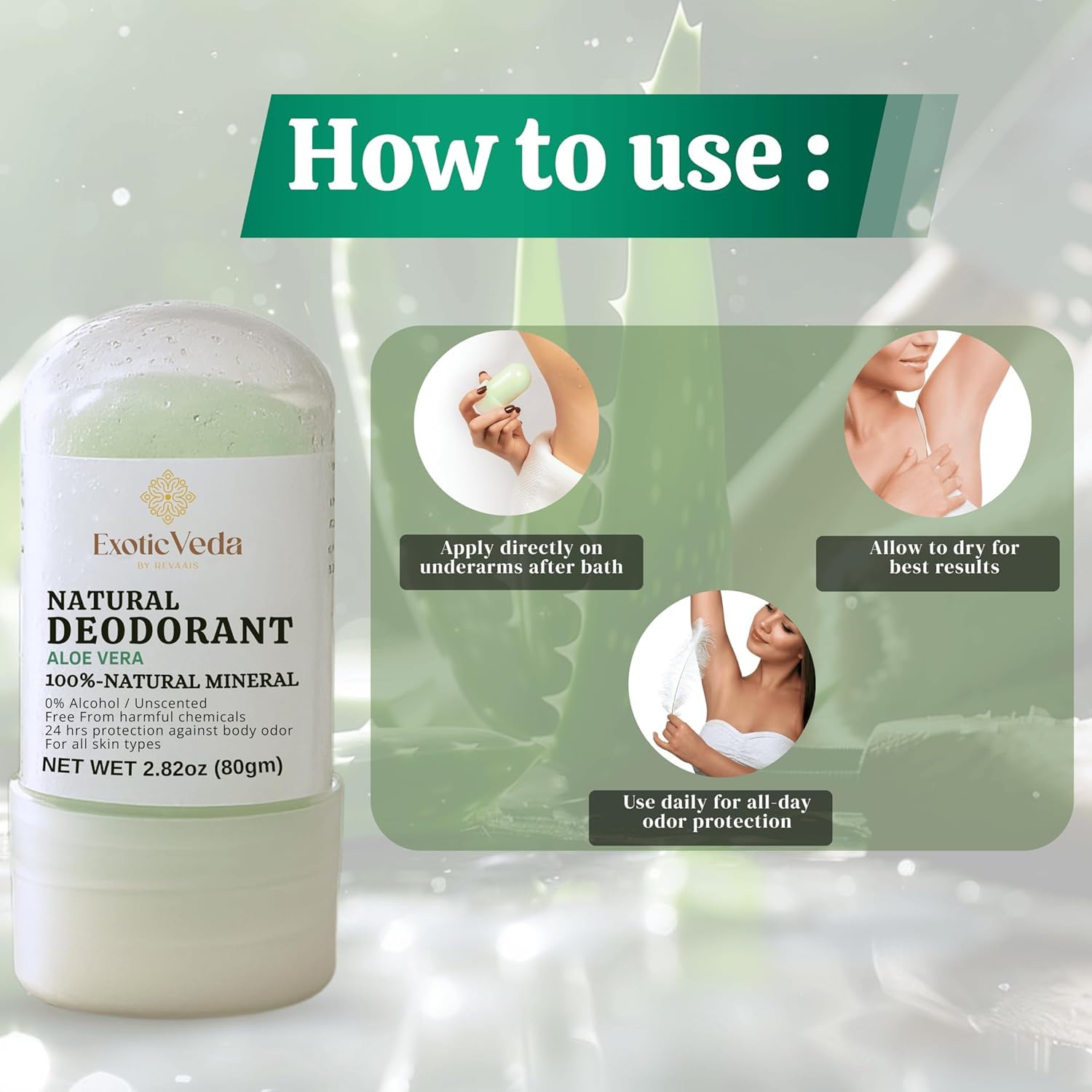 • Eco-Friendly, Vegan & Cruelty-Free Choice – Exotic Veda Alum Aloe Vera Deodorant Stick is designed for eco-conscious living. Made from natural mineral alum and soothing aloe vera, it is vegan, cruelty-free, and free from synthetic chemicals, making it a safe, gentle, and effective choice for all skin types. This natural deodorant provides reliable odor protection while caring for your skin and the planet. A perfect alternative to conventional deodorants, it supports a clean, sustainable, and healthier lifestyle every day.