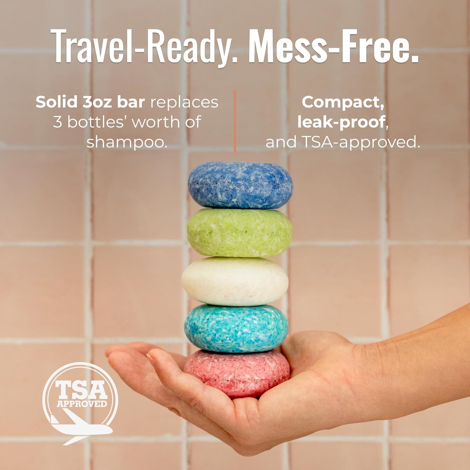 • COMPACT, TRAVEL-FRIENDLY DESIGN: This solid shampoo bar fits easily into any travel kit, is TSA approved, and eliminates messy liquid spills; perfect for gym bags, suitcases, or minimalist lifestyles