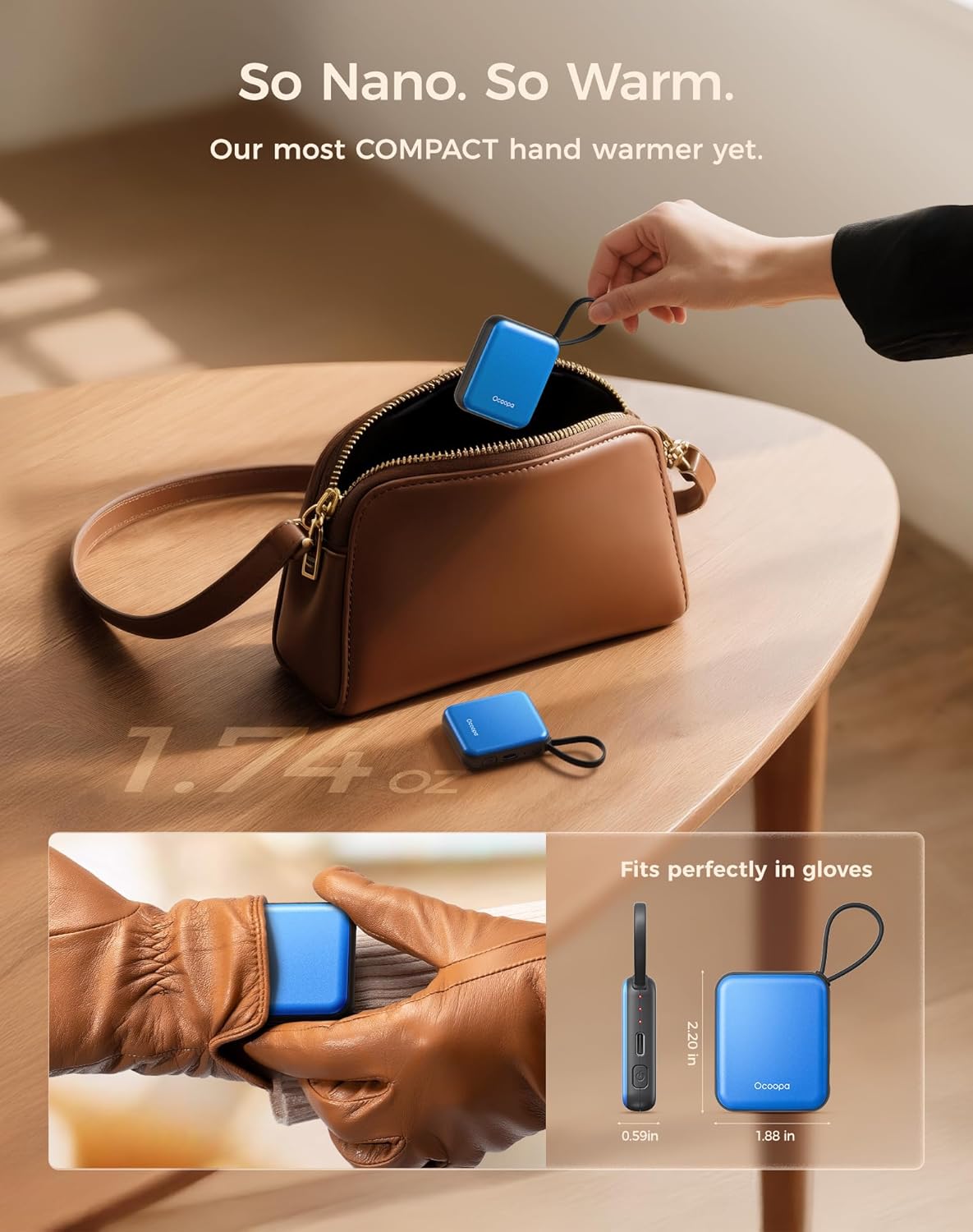 • Ultra-Nano Size – Designed for Her Hands: This ultra-slim rechargeable hand warmer smaller than your palm, lighter than a lipstick. UT5 Nano fits perfectly in gloves, pockets—even wallets. Tailored for women who love warmth without the bulk.