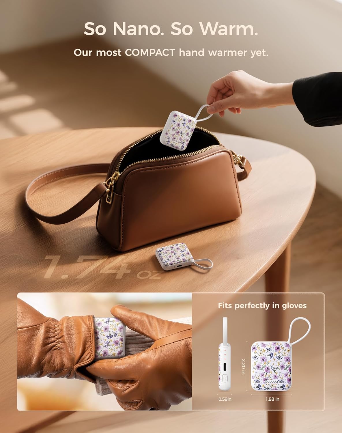 • Ultra-Nano Size – Designed for Her Hands: This ultra-slim rechargeable hand warmer smaller than your palm, lighter than a lipstick. UT5 Nano fits perfectly in gloves, pockets—even wallets. Tailored for women who love warmth without the bulk.