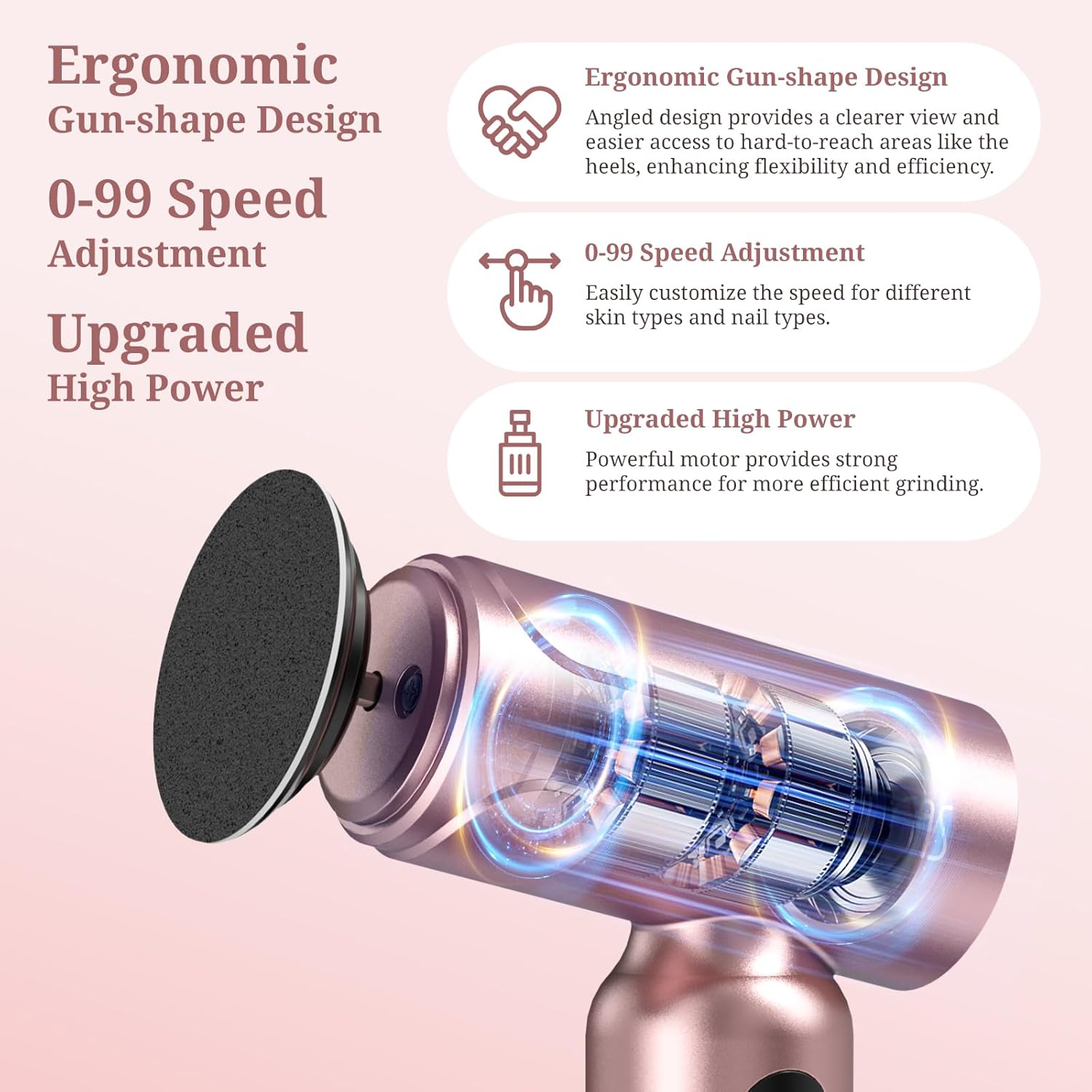 • [0-99 Speeds & High Power] -PELCAS Electric Foot File can adjust the speed from 0 - 99 levels, allowing you to easily customize the speed according to different skin types and nail types. The powerful motor provides strong performance for more efficient grinding. High-speed and stable rotation ensures smooth operation and is not easy to stall, making foot care easier and more effective. At the same time, it makes nail polishing more even, delicate and controllable.