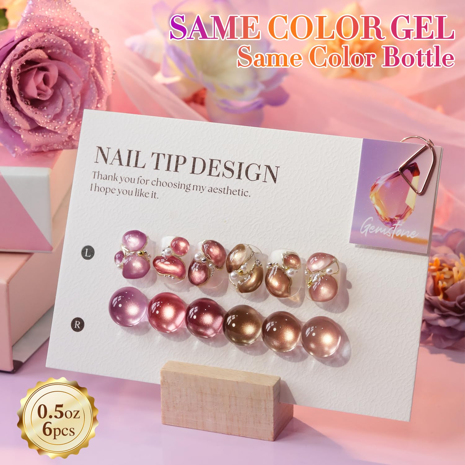 • 6 Pcs Same Color Same Bottle Gel Polish: 6pcs 15ml gel polish for all season, will come with color swatches.These gel polish kit need to be cured under UV or LED Lamp for 60-120s. Must apply with Base Gel and Top Coat. Please shake the bottle or warm it with hot water before use, to acheive a better effect.