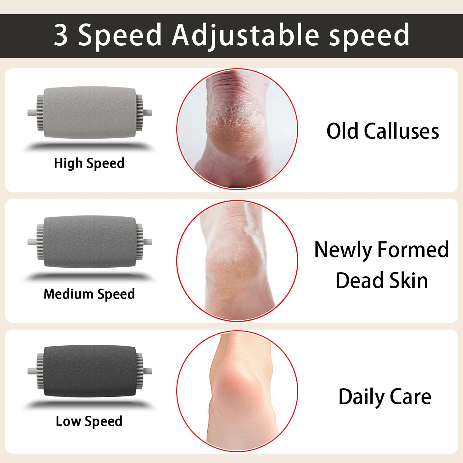 • 3-Speed Precision & Replaceable Heads: 3 adjustable speeds adapt to your skin's need. Swap between three abrasive heads for varying roughness level—ideal as a callus shaver for feet, hands, or toes. Perfect for dead skin scraper without irritation.