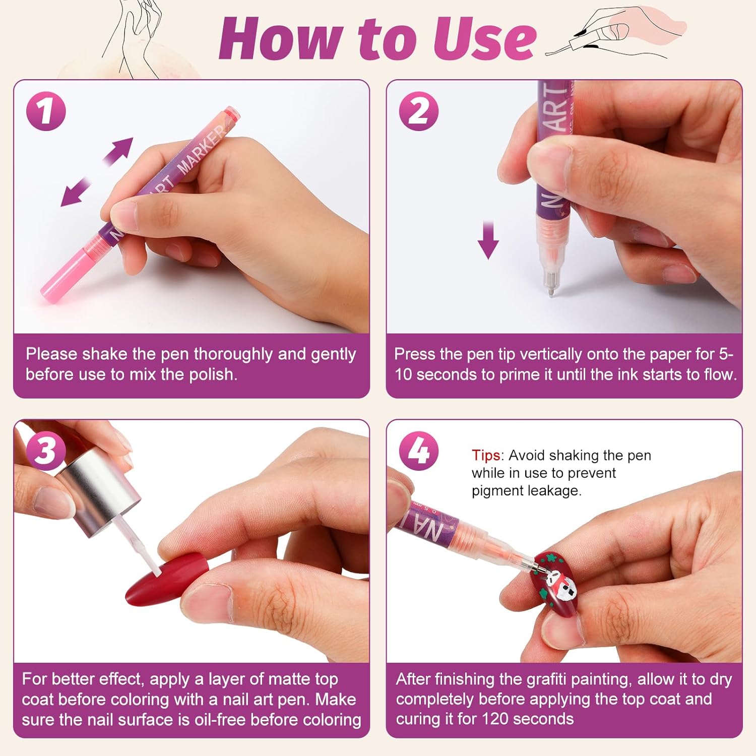• EASY TO USE: No professional nail art skills are required; you can start creating right away. Simply shake the pen gently before use and press the tip vertically for 2-3 seconds. The smooth ink flow and easy control ensure you'll quickly achieve a satisfying manicure