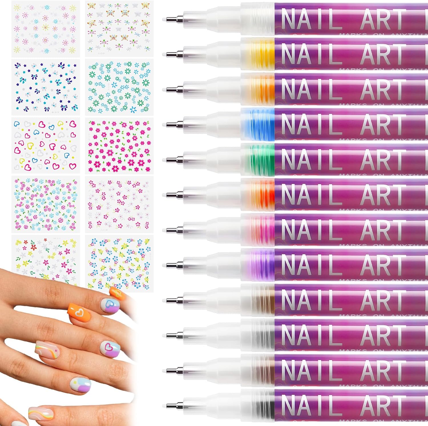 miikoul 12 Colors Nail Art Pens Set 0.7mm Art Graffiti Pen with 10PCS Nail Art Stickers 3D Nail Polish Paint Pens Quick Drying Waterproof Drawing Marker Pen for Nail Art Drawing and Salon DIY