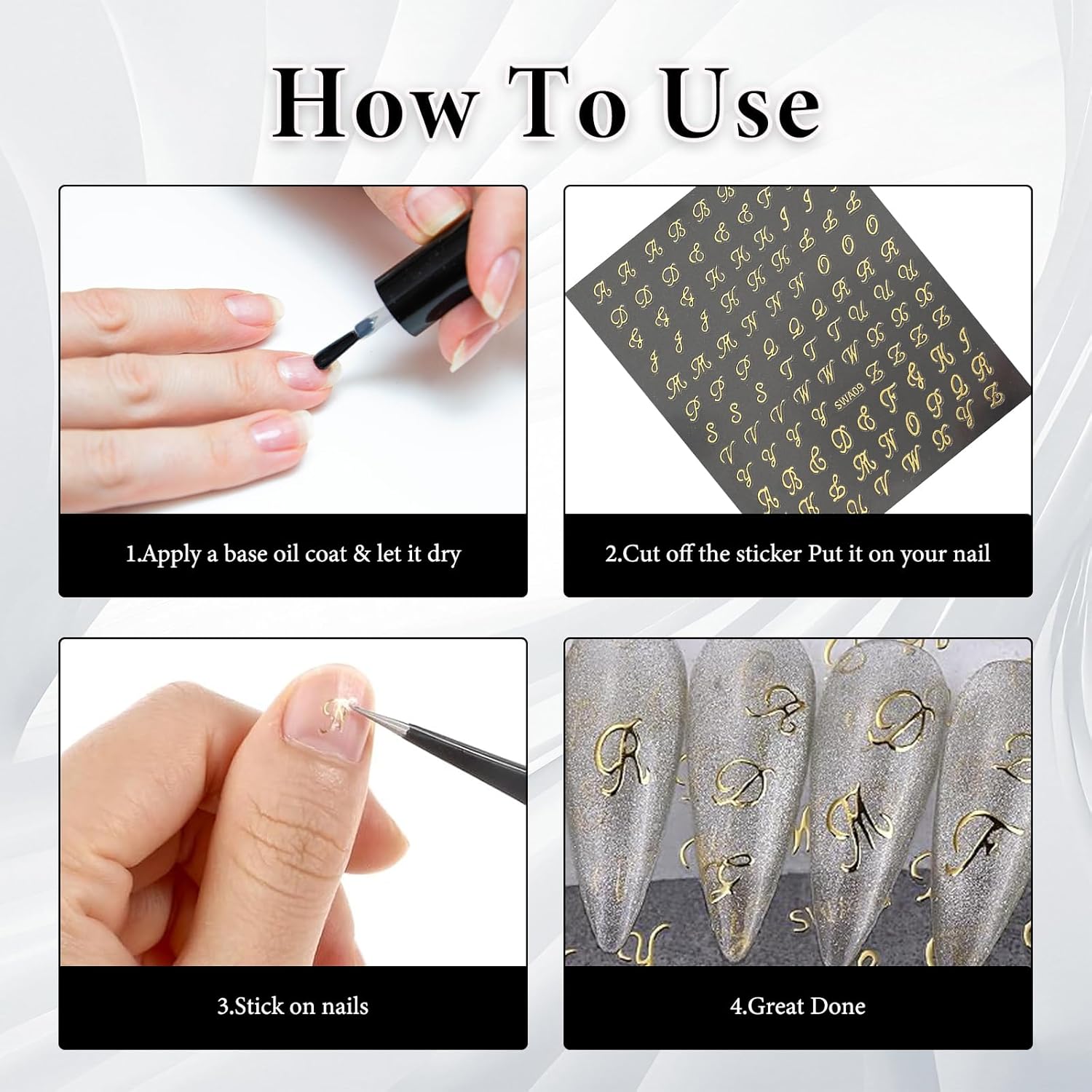 • Easy Application: Our gold nail stickers are self-adhesive, eliminating the need for glue. Using a pair of tweezers, you can easily pick up and place the small letter stickers onto your nails.For extended wear, seal the stickers for nails with a top coat to help your nail art stay in place and maintain its vibrant look.