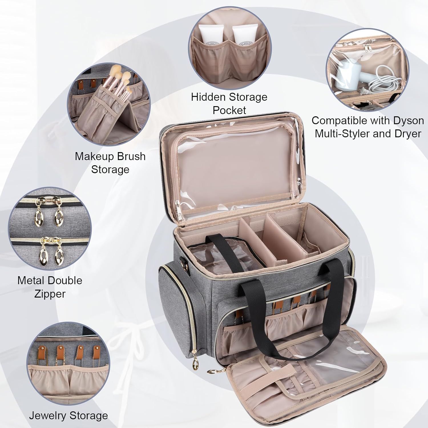 Large Makeup Bag, Portable Travel Makeup Bag Organizer for Women Girls with 2 Removable Pouches & Detachable Dividers, Cosmetic Travel Bag, Toiletry Bag for Makeup and Hair Supplies Grey