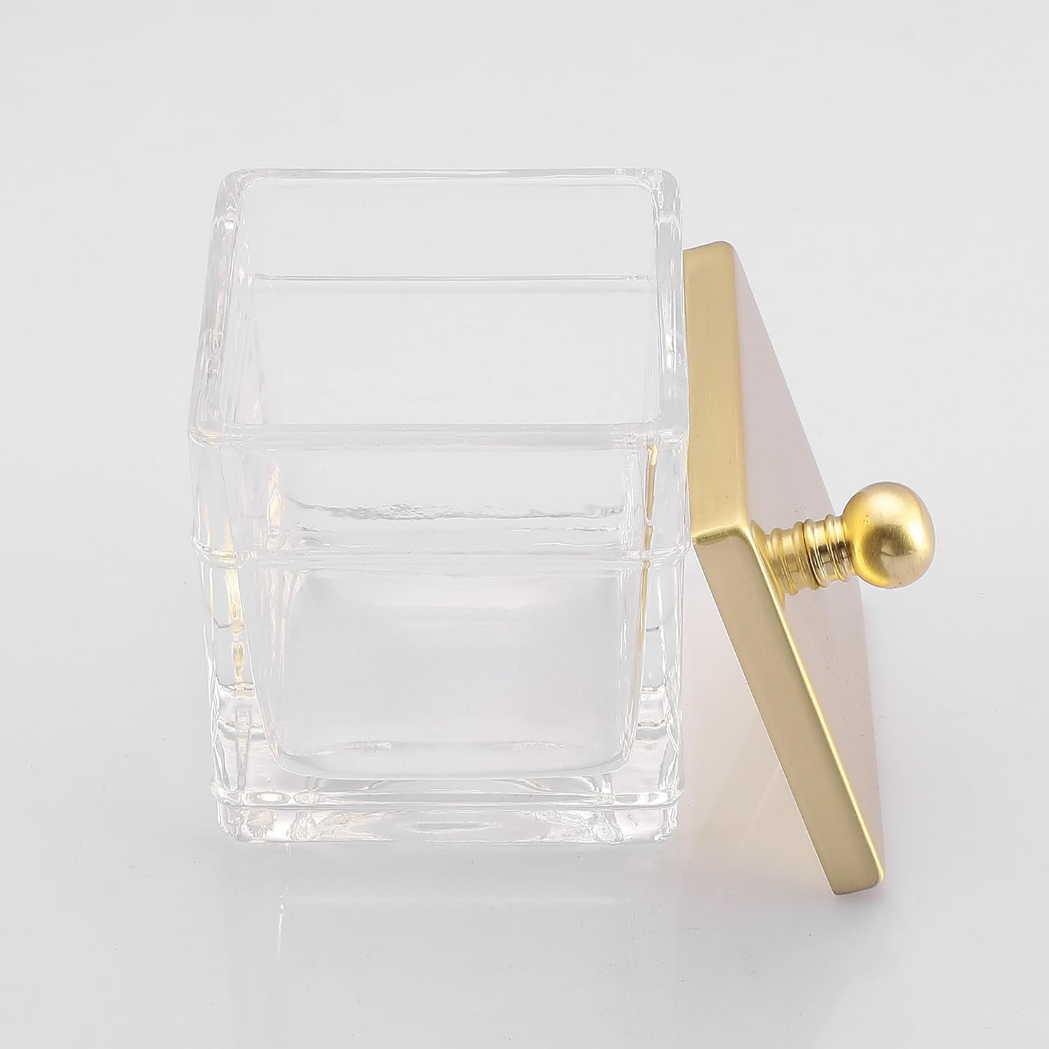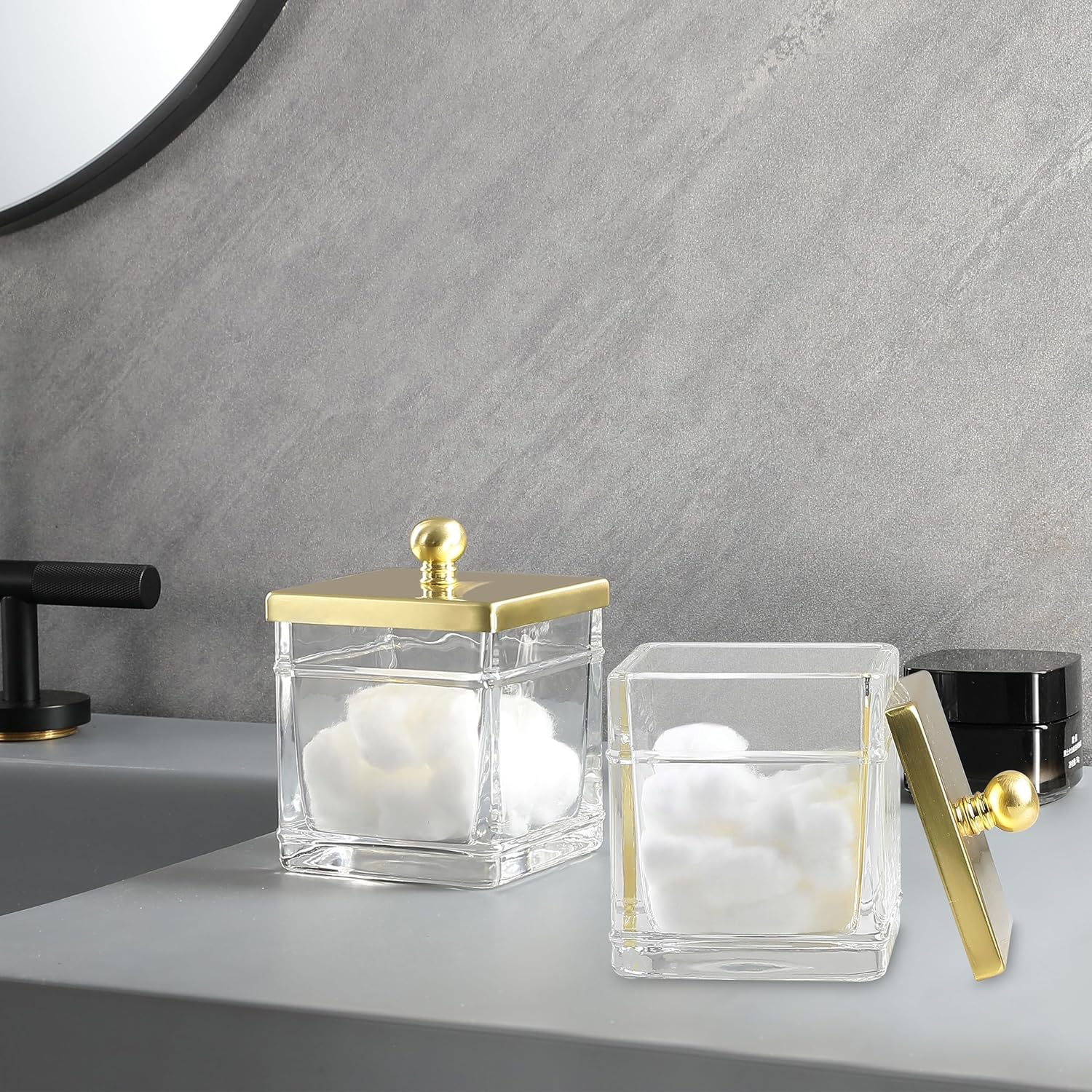 • This sleek vanity qtip holder provides a decorative accent to your powder room, bathroom vanity, makeup table and more; The unique design with removable lid gives you a variety of storage options.This canister is great for storing and organizing cotton swabs, ovals and rounds, makeup applicators, cosmetic sponges, wedges, guest soaps, bath bombs, balls, salts and more.