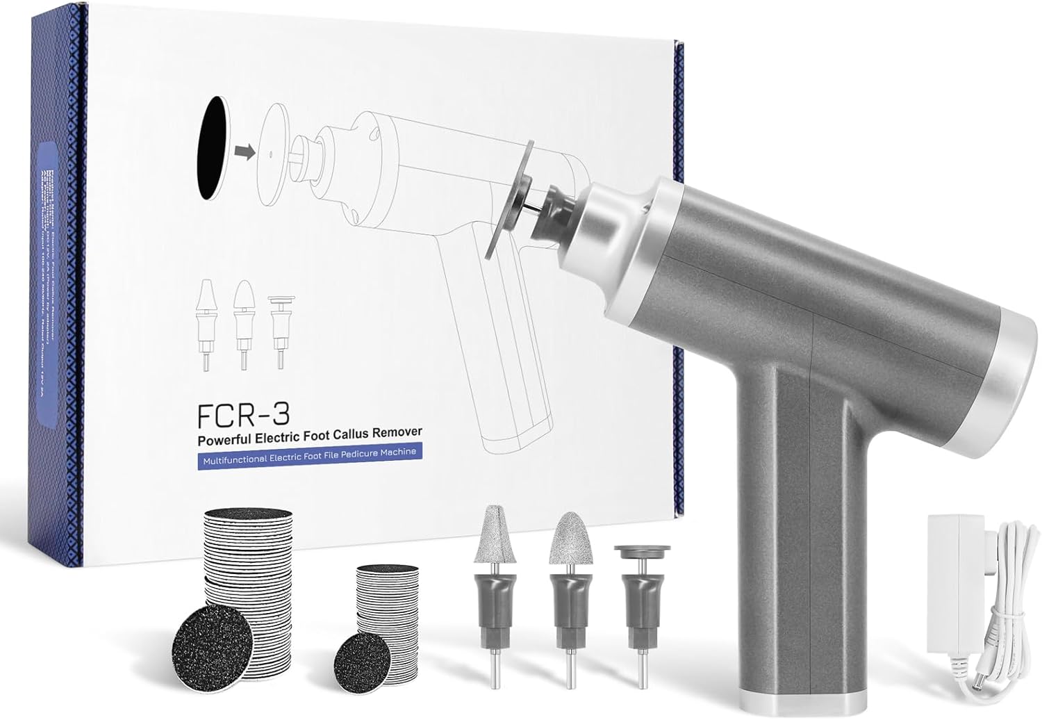 • PACKAGE DETAILS: 1pc professional FCR-3 electric foot callus remover (gray), 1pc big round grinding head (use with big sandpaper), 1pc small round grinding head (use with small sandpaper), 2pc tapered grinding heads (no need sandpaper), 60pcs big sandpaper discs, 20pcs small sandpaper discs.