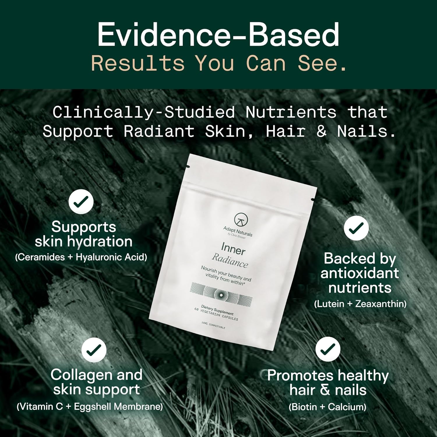• EVIDENCE-BASED, QUALITY INGREDIENTS: Adapt Naturals Inner Radiance combines a synergistic blend of clinically studied nail hair skin vitamins and ingredients—including eggshell membrane collagen, hyaluronic acid, rice ceramides, lutein & zeaxanthin, biotin, and vitamin C—delivered at research-backed doses to nourish your beauty and vitality from within.