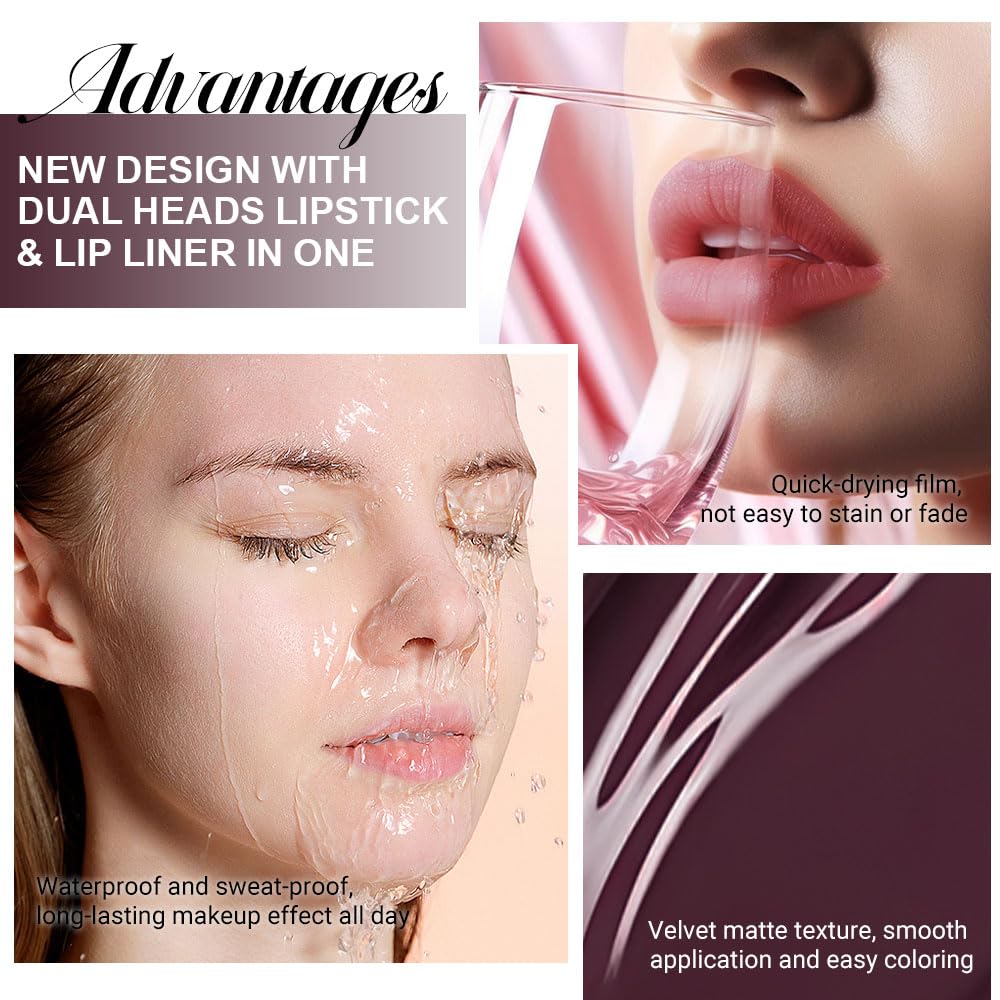 • 2 IN 1 Lip Liner & Matte Liquid Lipstick: The double ended design made you can use lipstick and lip liner on both ends. New design with dual heads lipstick & lip liner in one, for draw delicate lip line before applying lipstick. It combines lip line and metallic lipstick and makes double-end lipstick more perfect,meets the need of all occasions.