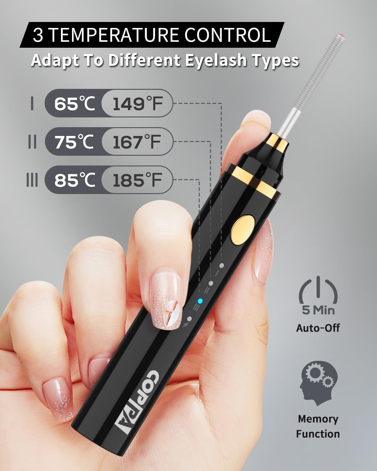 • ใ€๐€๐๐ฃ๐ฎ๐ฌ๐ญ๐š๐›๐ฅ๐ž ๐“๐ž๐ฆ๐ฉ๐ž๐ซ๐š๐ญ๐ฎ๐ซ๐ž ๐’๐ž๐ญ๐ญ๐ข๐ง๐ ๐ฌใ€‘๐…๐ž๐š๐ญ๐ฎ๐ซ๐ž๐ฌ ๐Ÿ‘ ๐ก๐ž๐š๐ญ ๐ฌ๐ž๐ญ๐ญ๐ข๐ง๐ ๐ฌ (๐Ÿ”๐Ÿ“ยฐ๐‚/๐Ÿ•๐Ÿ“ยฐ๐‚/๐Ÿ–๐Ÿ“ยฐ๐‚). Level 1 65 โ„ƒ for soft short eyelashes, level 2 75 โ„ƒ for normal thickness of eyelashes, level 3 85 โ„ƒ for long hard eyelashes. The ๐ฆ๐ž๐ฆ๐จ๐ซ๐ฒ ๐Ÿ๐ฎ๐ง๐œ๐ญ๐ข๐จ๐ง saves your preferred temperature, while the ๐š๐ฎ๐ญ๐จ-๐ฌ๐ก๐ฎ๐ญ๐จ๐Ÿ๐Ÿ ensures worry-free operation.