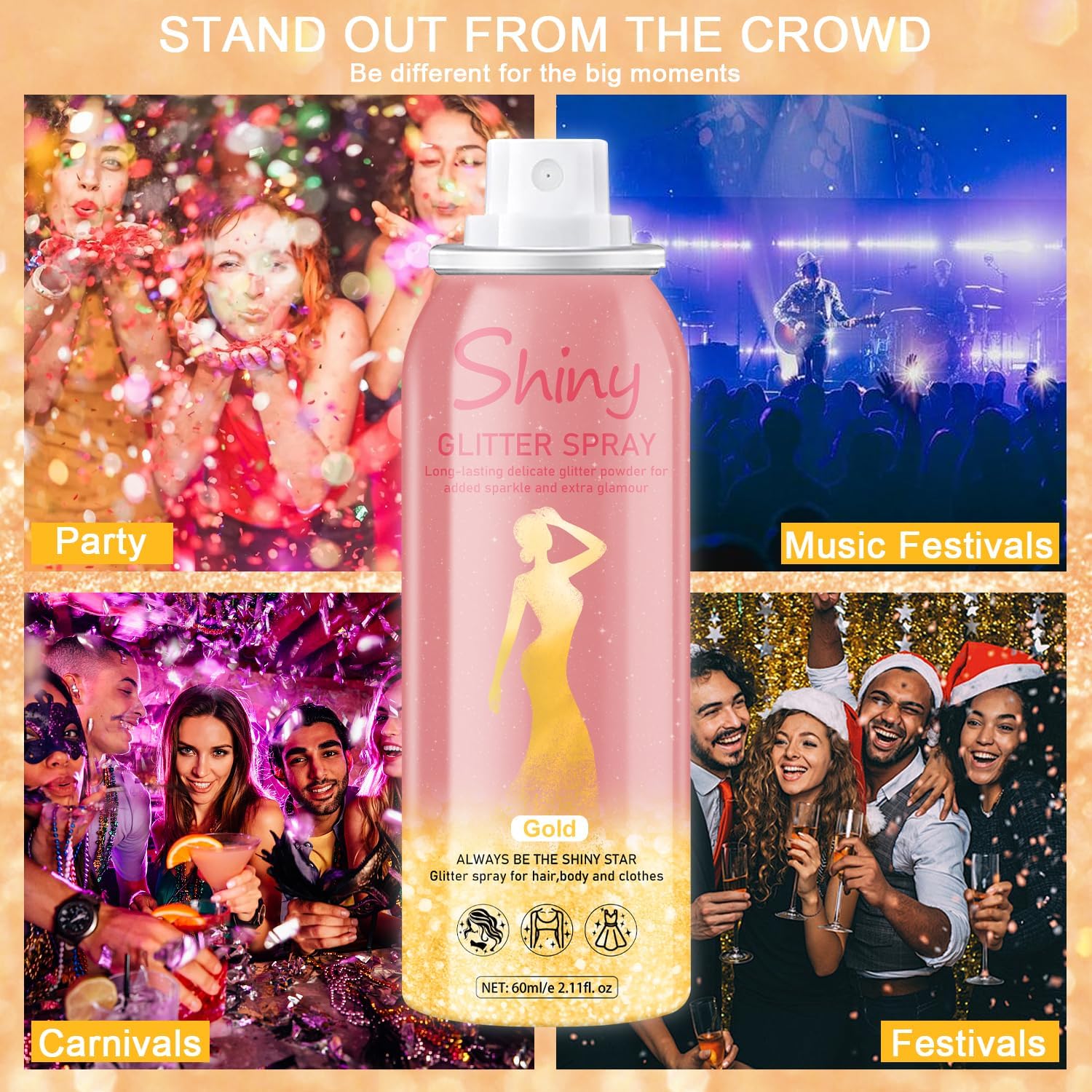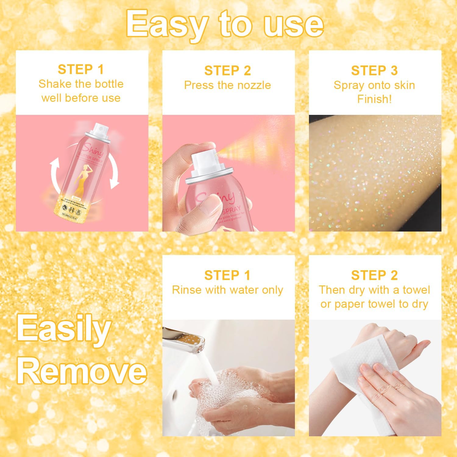 • Glitter Body Spray - The delicate and light glitter shimmer Powder easily to spray on hair, eyes, face, body, leg and clothing with shimmer makeup effect. Perfect to enhance skin gloss, unlock and set your shimmer makeup.