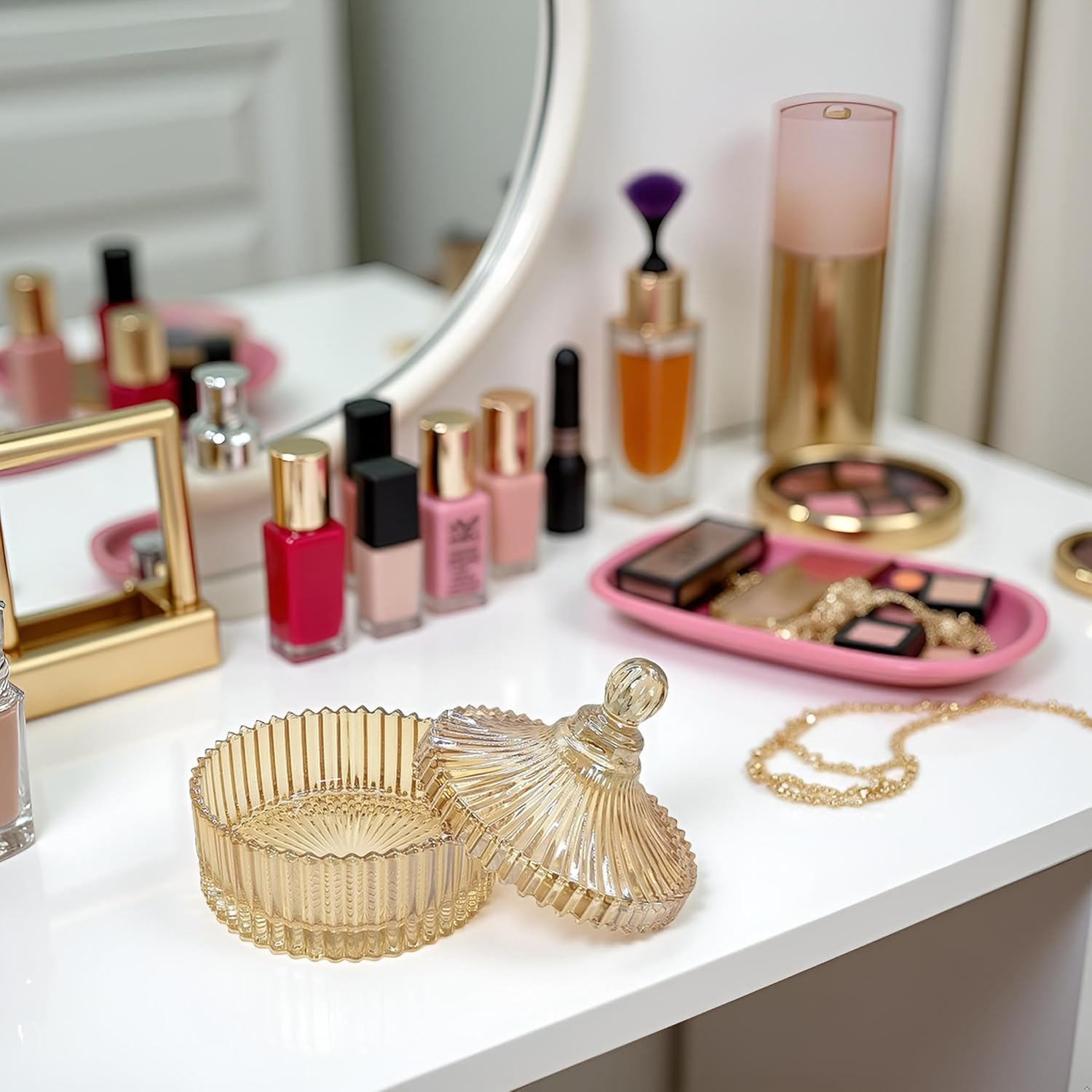 • 【Multi-Purpose Glass Heart Box】This glass powder puff container can not only be used to organize your powder puffs, but also can be used to store earrings, rings, bracelets, hair accessories, trinkets and other items on your vanity, bathroom and bedroom. It can keep your items away from dust and water, and play a protective and decorative role to meet the needs of female users for cosmetic organization