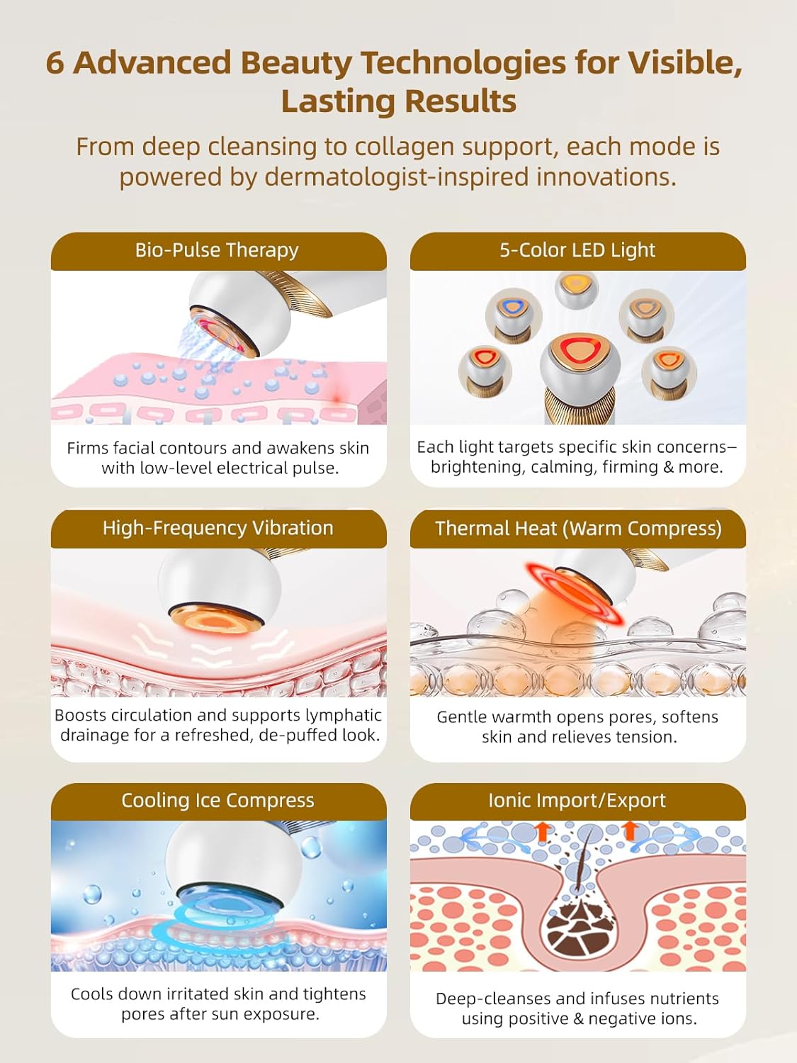 • 6-in-1 Multifunctional Facial Device for Instant Lift & Long-Lasting Firmness: Achieve spa-quality results at home with this all-in-one device. It combines microcurrent, ion cleansing & infusion, vibration, heating, cooling, and 5-color LED light therapy to tighten skin, reduce wrinkles, deeply cleanse, enhance skincare absorption. Experience instant lifting & long-lasting firmness, revealing smoother, firmer, more youthful skin. Ideal for daily use to maintain a vibrant, youthful complexion.