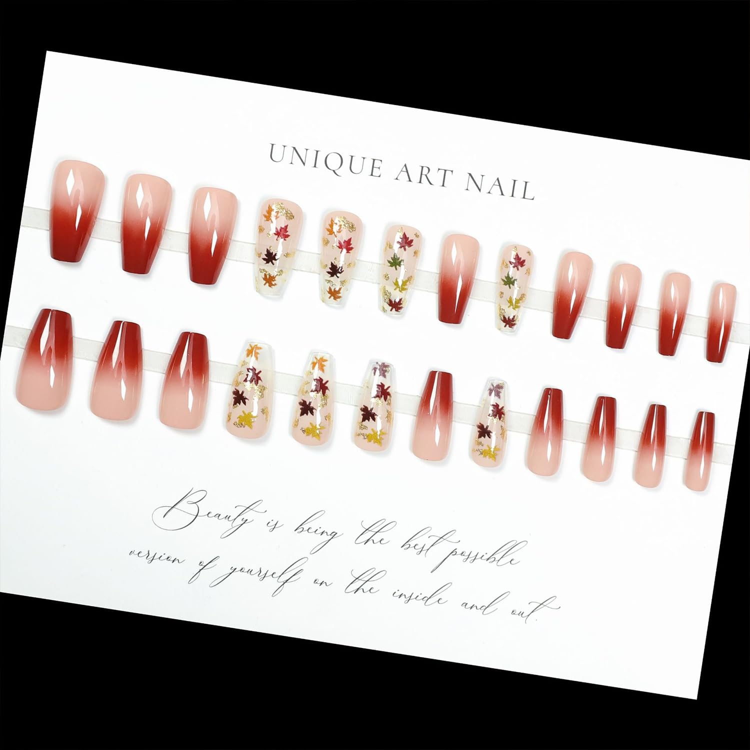 • Easy to Use: Instead of spend lots time and money at nail salon, you can change you nails style in 15 minutes anytime and anywhere. The maple leaves fake nails will stay longer if you clean your nails before use, and avoid water within the first hour of wearing