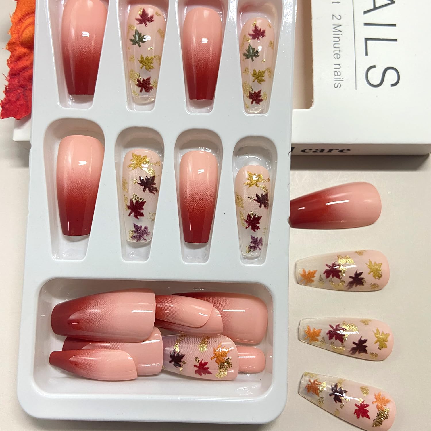 • Package: You'll get 24 fall maple leaf fake nails in 12 sizes. 1 mini nail file, 1 small wooden stick, 1 piece of adhesive tab glue. You can safely choose a fake nail that fits your finger size and DIY your desired nail shape
