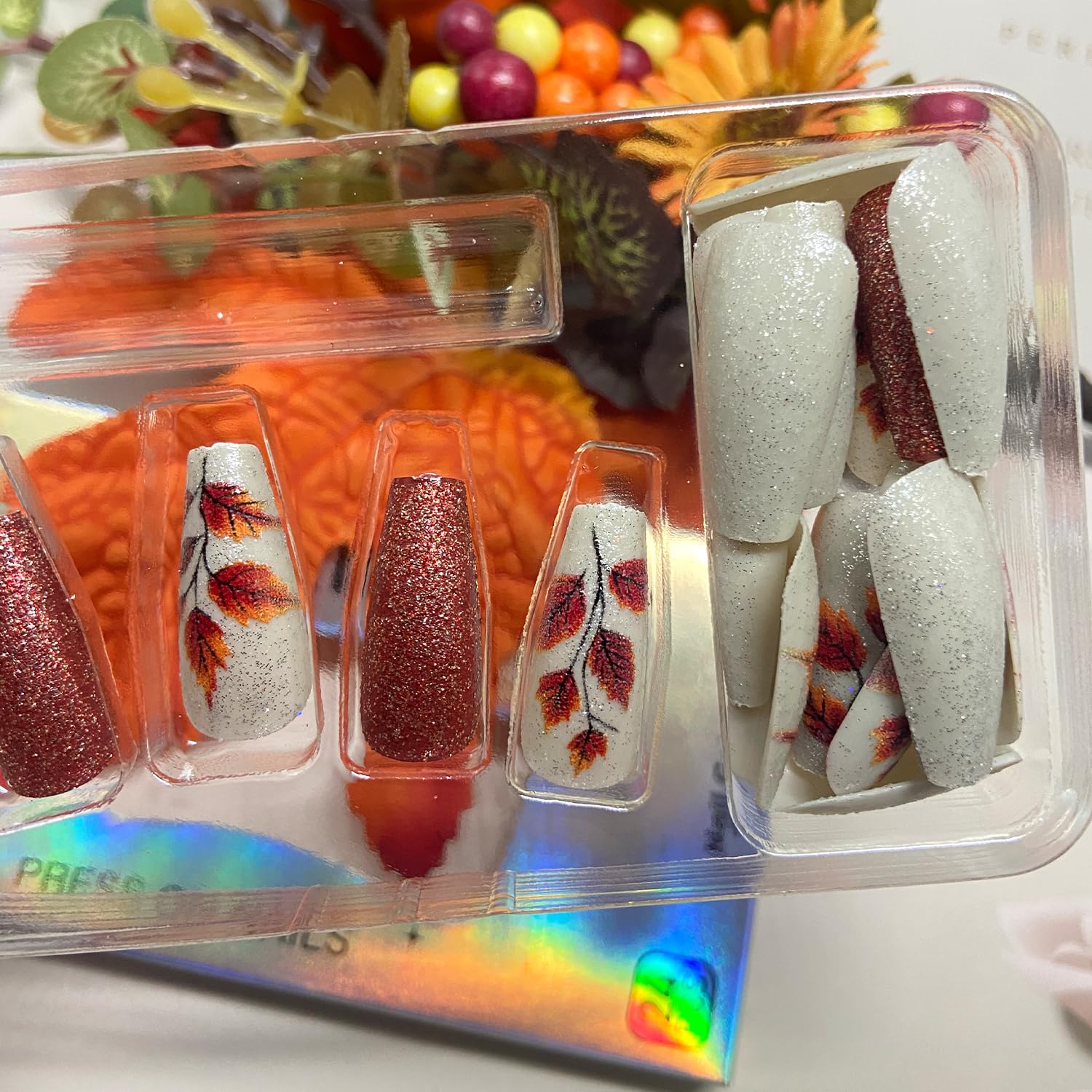 • Easy to Use: Instead of spend lots time and money at nail salon, you can change you nails style in 15 minutes anytime and anywhere. The maple leaves fake nails will stay longer if you clean your nails before use, and avoid water within the first hour of wearing